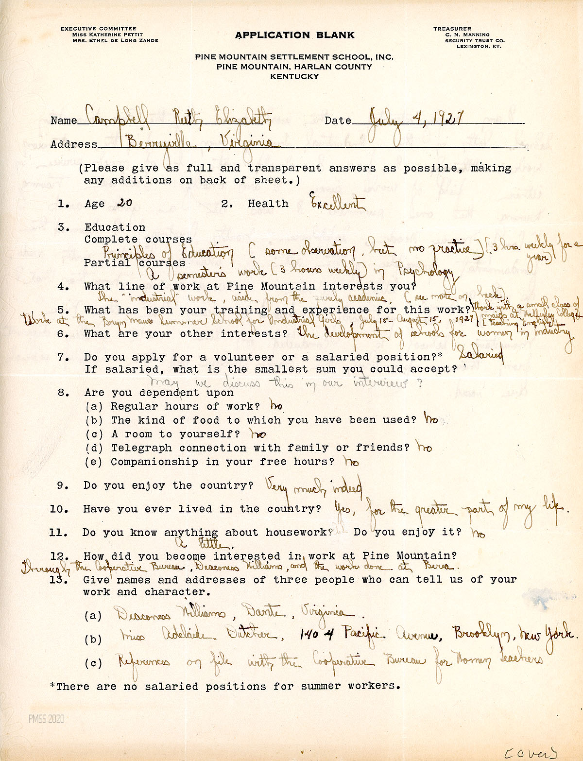 [001] July 4, 1927. Application Blank for PMSS position with handwritten entries by “Campbell, Ruth Elizabeth,” Berryville, VA. Age: 20.