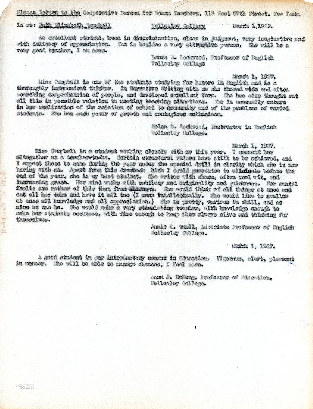 [004] March 1, 1927. Carbon copy of a typewritten report from Cooperative Bureau for Women Teachers, listing statements concerning Campbell from four professors at Wellesley College.
