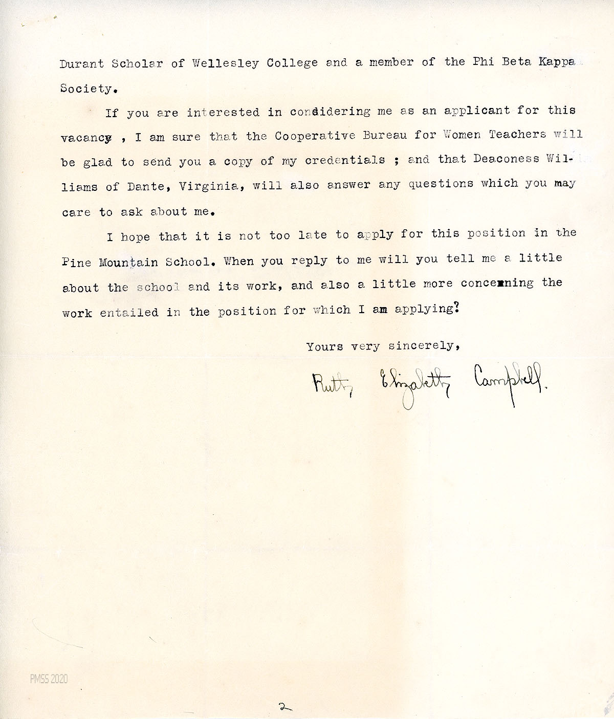 [005], [005a] June 26, 1927. Two-page typewritten letter to Wells from Campbell in Berryville, VA, expressing her interest in the PMSS vacancy for a teacher of English and History, and providing details of her education and experience.