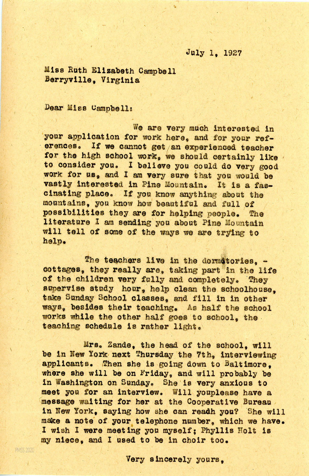 [006] July 1, 1927. To Campbell from [unsigned], who tells Campbell that the School would like to consider her if an experienced teacher for the high school cannot be found. “If you know anything about the mountains, you know how beautiful and full of possibilities they are for helping people. … The teachers live in the dormitories — cottages, they really are, taking part in the life of the children very fully and completely. They supervise study hour, help clean the schoolhouse, take Sunday School classes, and fill in in other ways, besides their teaching. As half the school works while the other half goes to school, the teaching schedule is rather light.” Asks Campbell to make arrangements to be interviewed by Mrs. [Ethel de Long] Zande, Co-Director, who will be in New York.