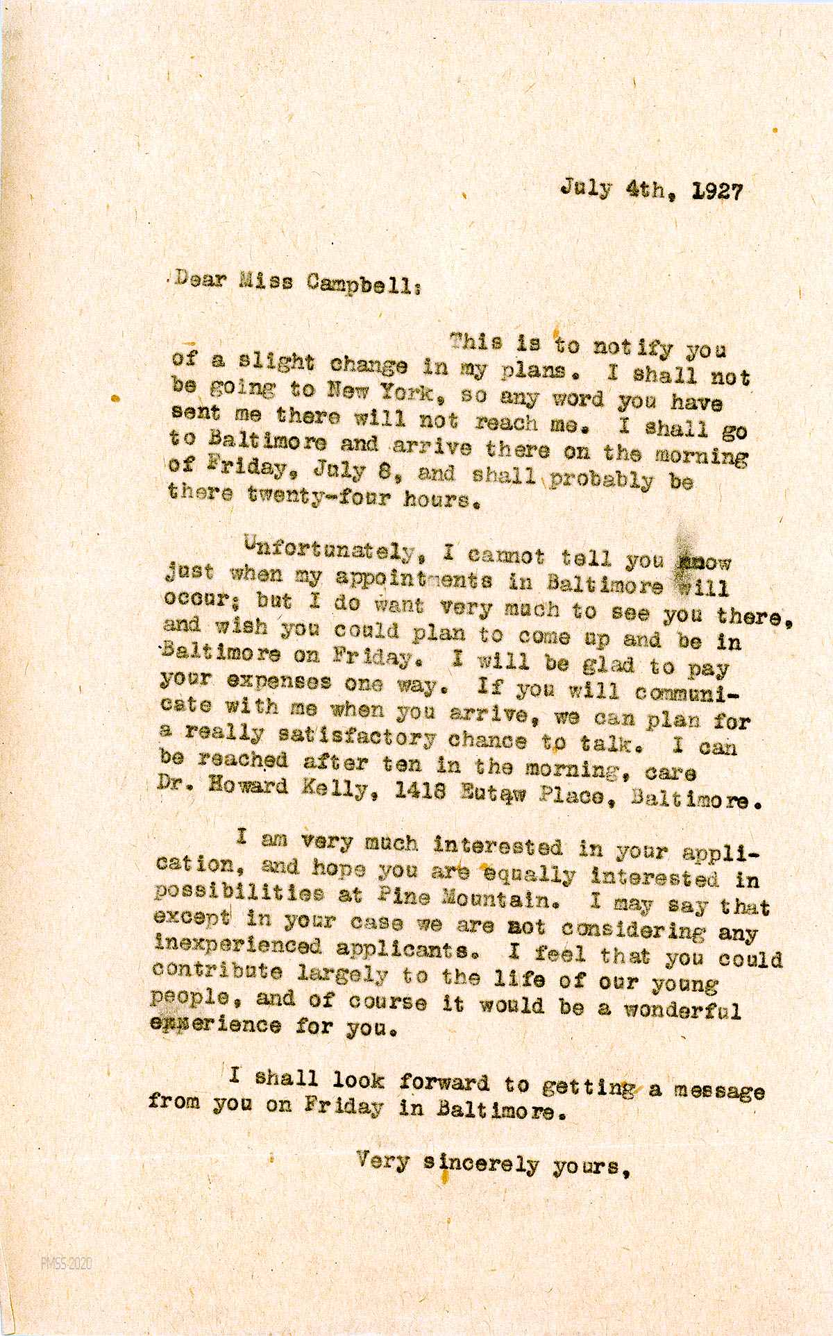 [007] July 4, 1927. To Campbell from [unsigned, possibly Mrs. Zande], notifying her of a change in plans; will not be in New York, but will arrive in Baltimore on July 8, where she hopes to meet with Campbell. Gives her contact information as in care of Dr. Howard Kelly in Baltimore. ”...[E]xcept in your case we are not considering any inexperienced applicants. I feel that you could contribute largely to the life of our young people, and of course it would be a wonderful experience for you.”