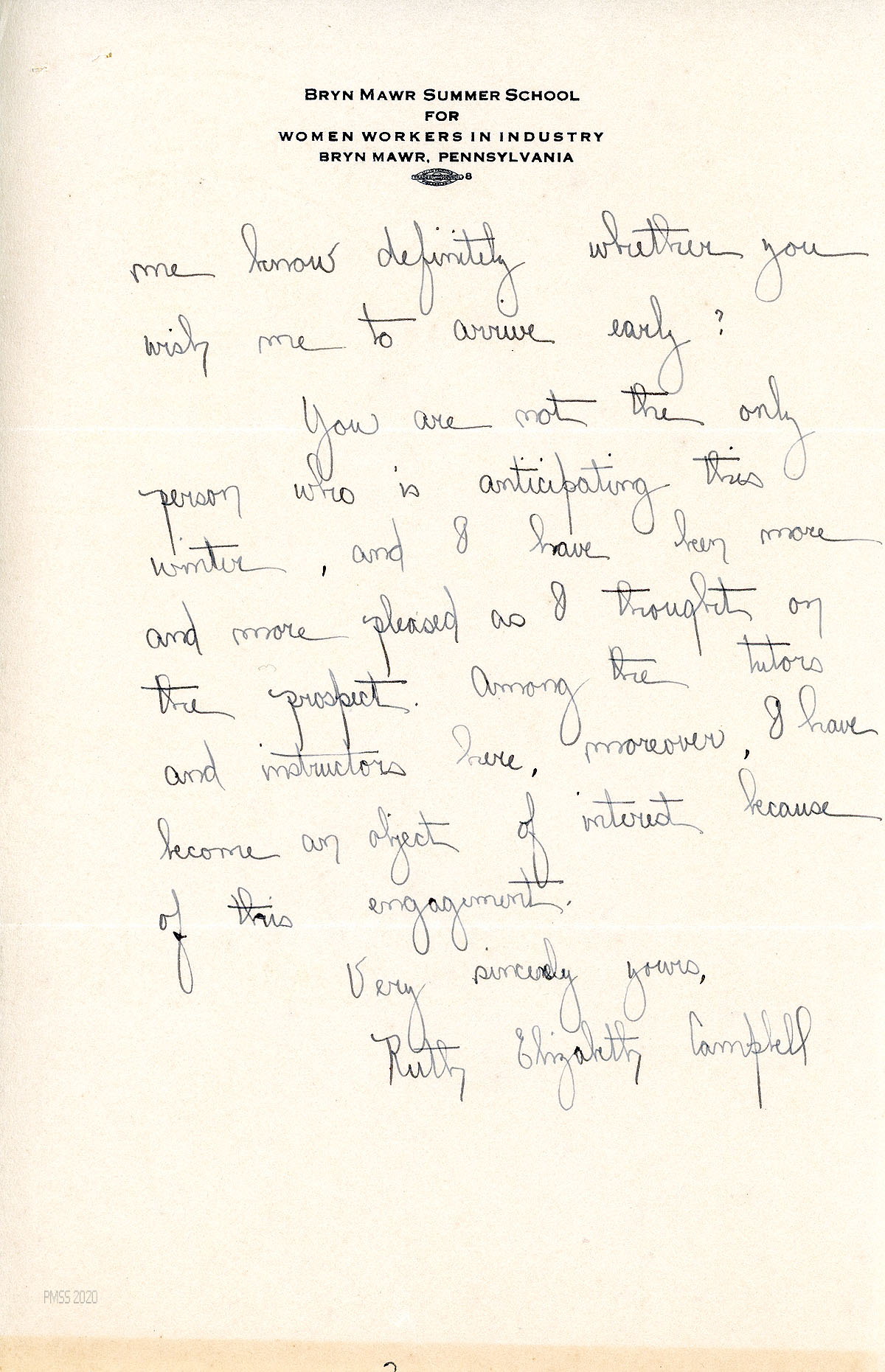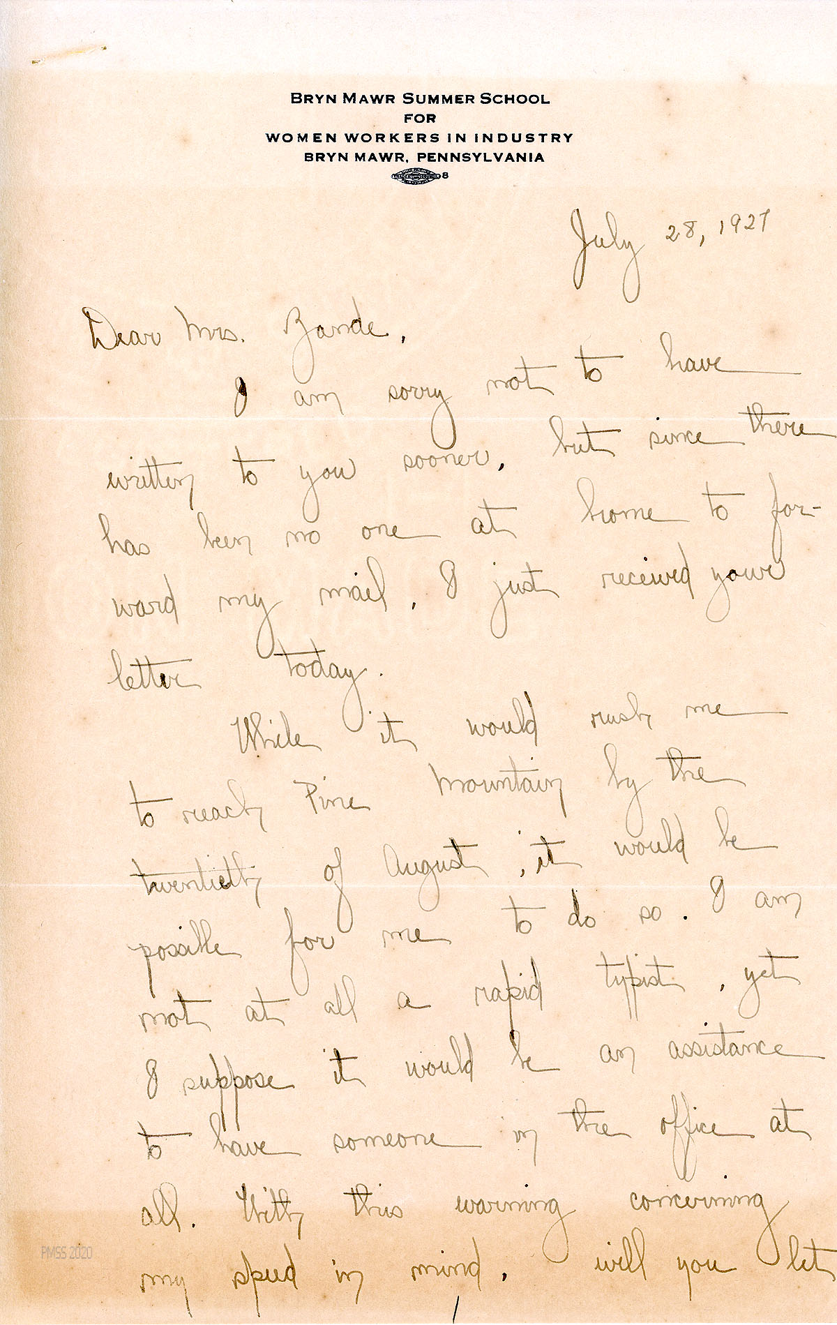[010], [010a] July 28, 1927. Handwritten two-page letter to Zande from Campbell at Bryn Mawr Summer School for Women Workers in Industry, Bryn Mawr, PA, who agrees to arrive on August 20th to help in the Office. Expresses her anticipation of PMSS work. “Among the tutors and instructors here, moreover, I have become an object of interest because of this engagement.”