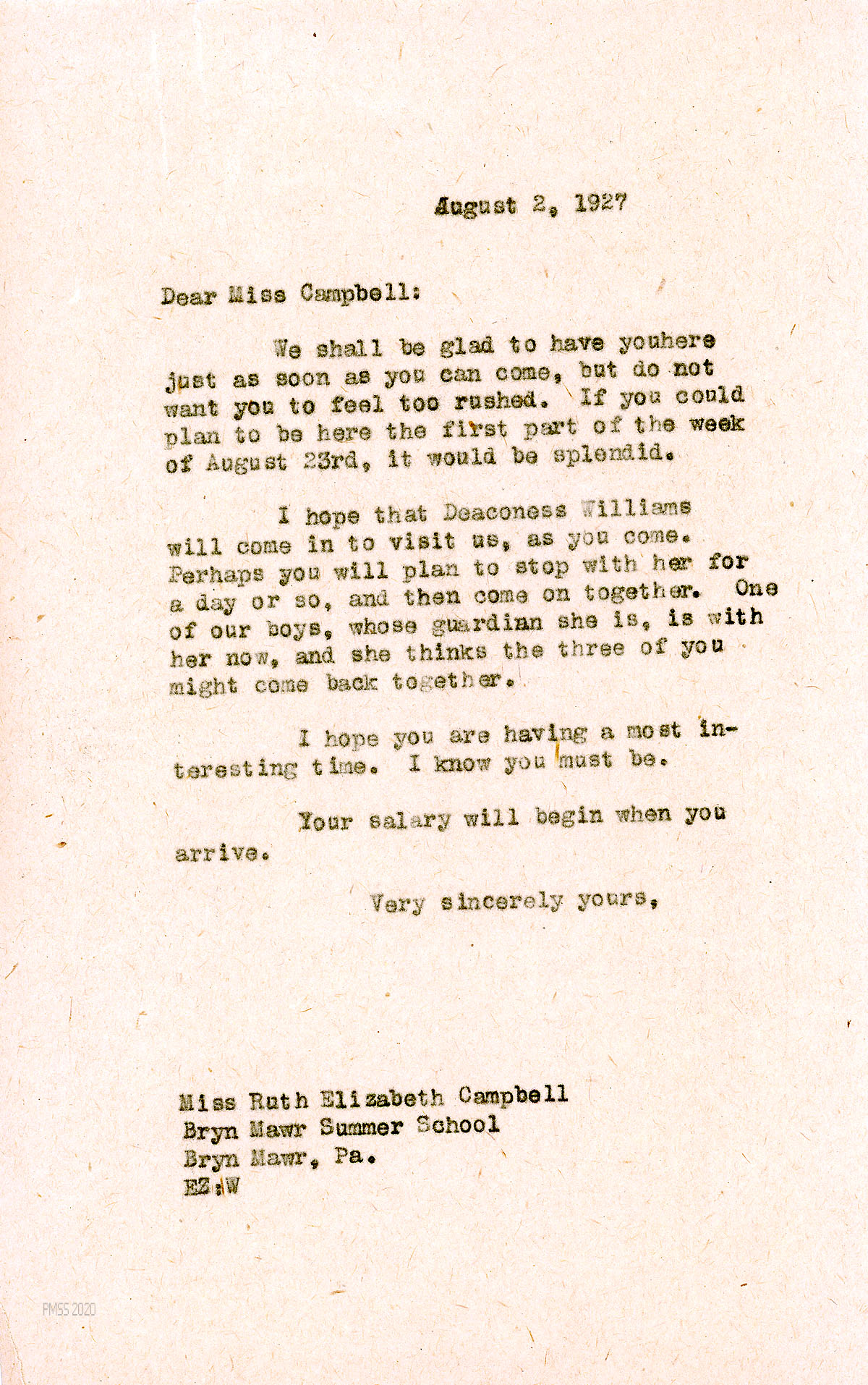 [012] August 2, 1927. To Campbell from EZ [Zande]. Welcomes her in August; suggests that she bring Deaconess Williams (who is a guardian of one of the boys at PMSS).