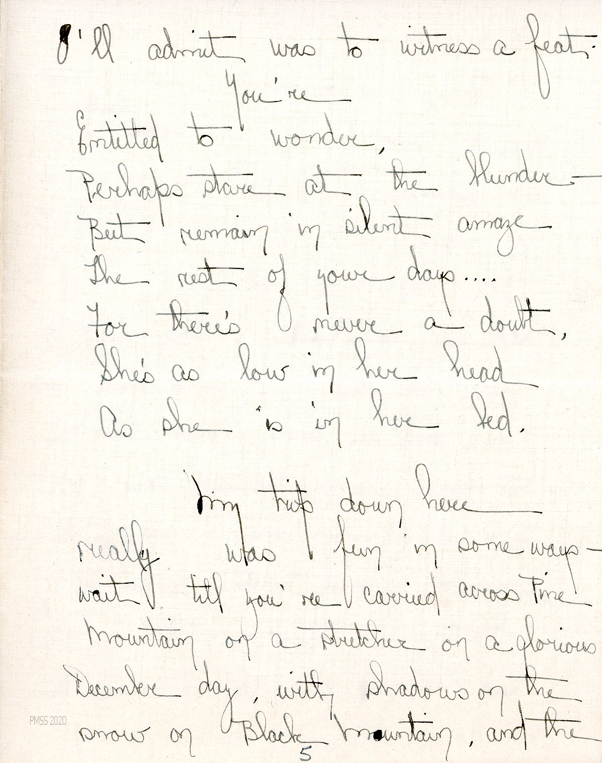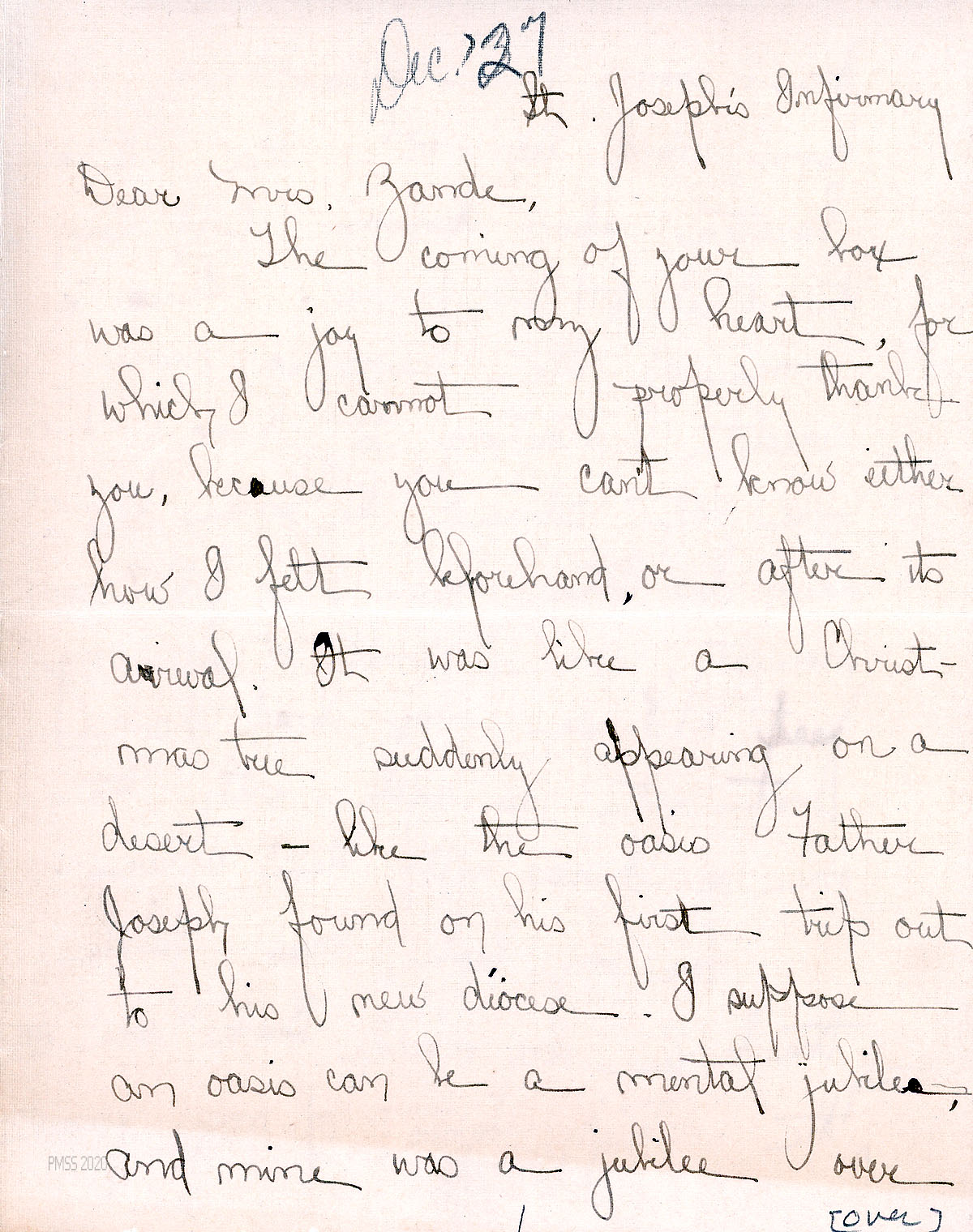 [013] through [013k] N.D. (Notation: “Dec. ‘27“), Twelve-page letter to Zande from Campbell at St. Joseph’s Infirmary [in Louisville, KY], [013]-[013a] who greatly appreciates the box of items from Zande. [013b] She becomes philosophical and asks, “Do you not admire the serious turn my mind has taken since my fall? From necessity, since I cannot use my feet, I use my head. I am not yet as agile with the one as I was with the other.” She thanks Zande for the book; [013c] mentions Willa Cather and “The Professor’s House”; writes a poem about her bed-ridden condition. [013d]-[013f] Describes being “carried across Pine Mountain on a stretcher on a glorious December day, with shadows on the snow on Black Mountain, and the sound of wind coming down the hollows….surrounded by an escort of six mountain men. Lighted only by a lantern and a flashlight. You wait for the train; till you’re hoisted from below and pulled from above through a Pullman window by the assistance of interested brakemen, conductors, and passengers, and lowered again the next morning by the same method to the Louisville platform, to the great pleasure of all onlookers. There is zest in such a trip.”