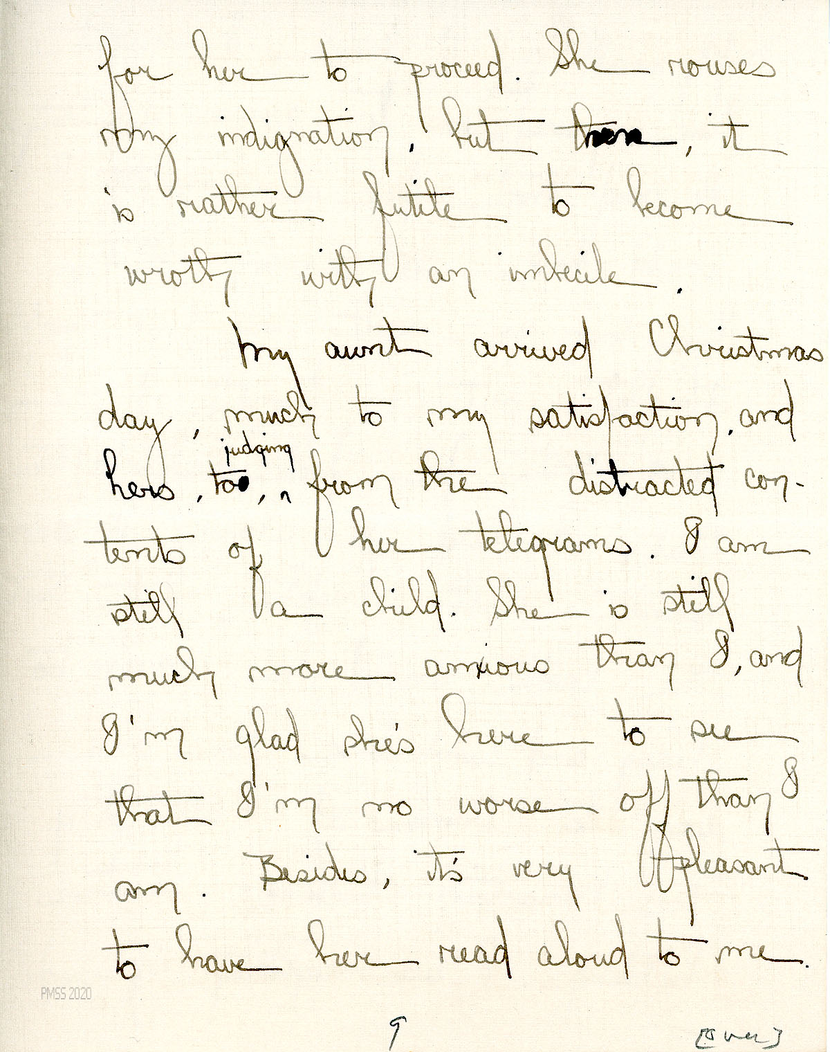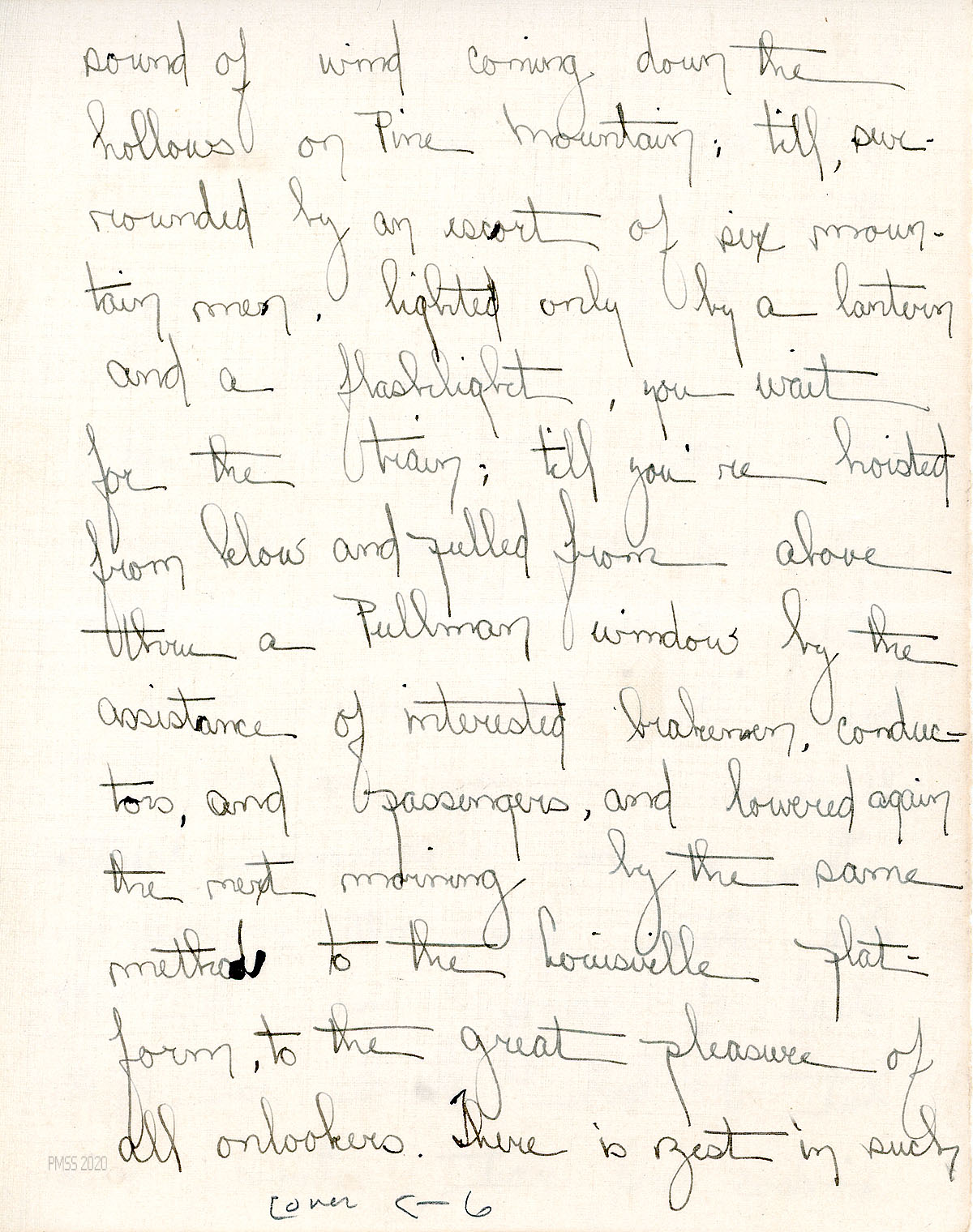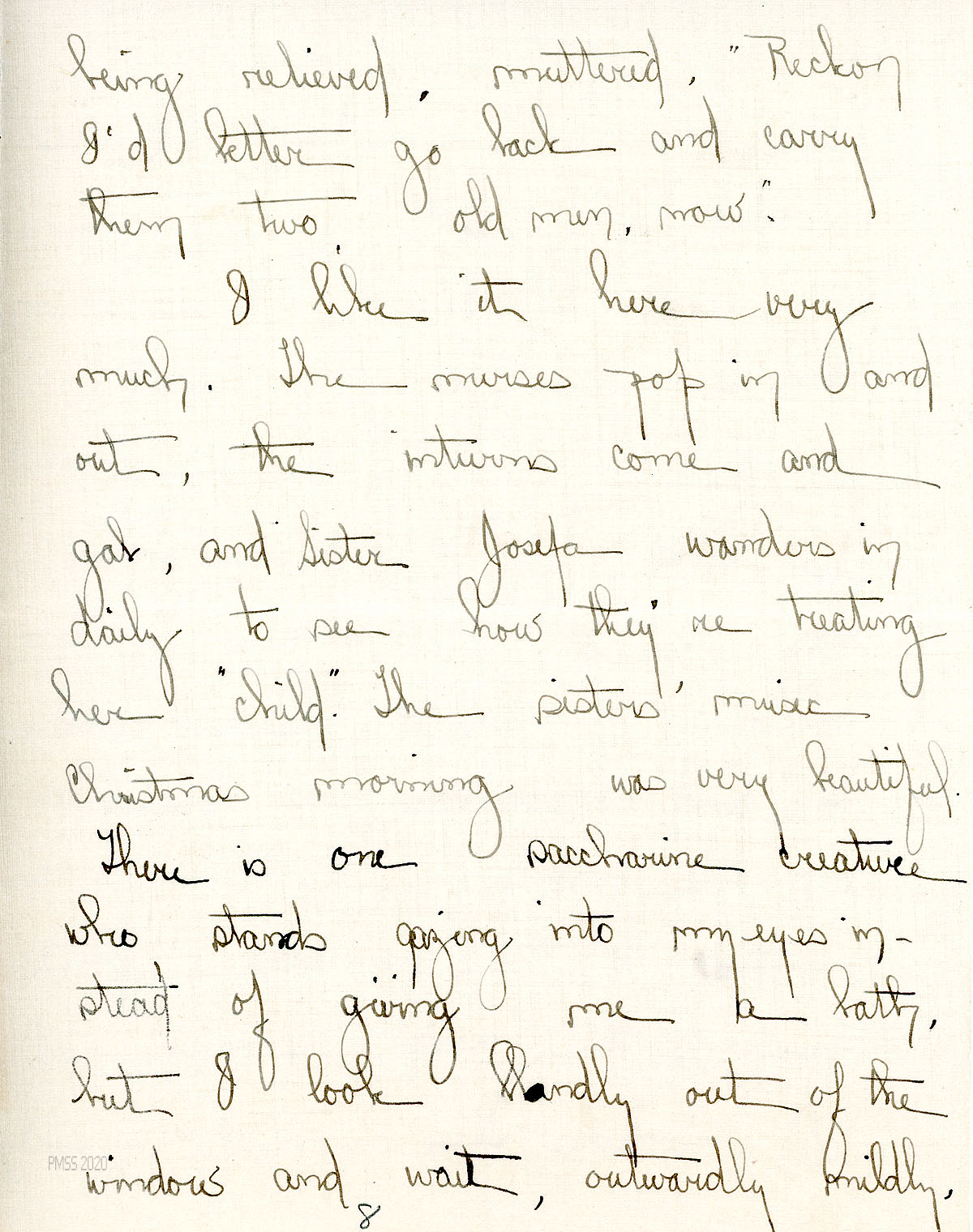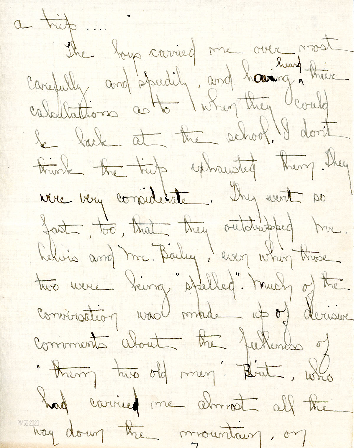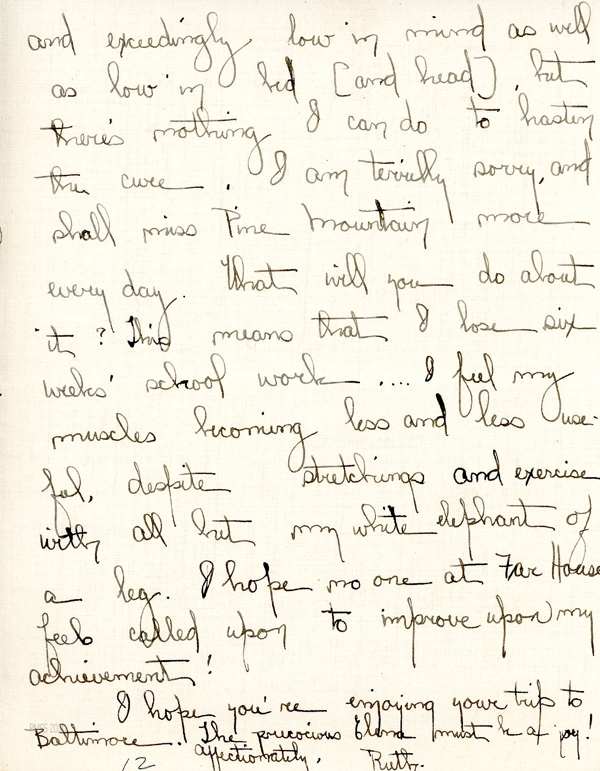 [013f] Mentions Mr. Lewis, Mr. Bailey [Dr. Clark Bailey)], and Brit [Wilder] as among the six who carried her over the mountain. [013g]-[013i] Describes her care by nurses, interns, and the sisters; her aunt’s visit; leaves for home on Friday, which she describes. [013j], [013k] Dr. Abell tells her that her recovery may take 6-8 weeks, which depresses her. “[I] shall miss Pine Mountain more every day.”