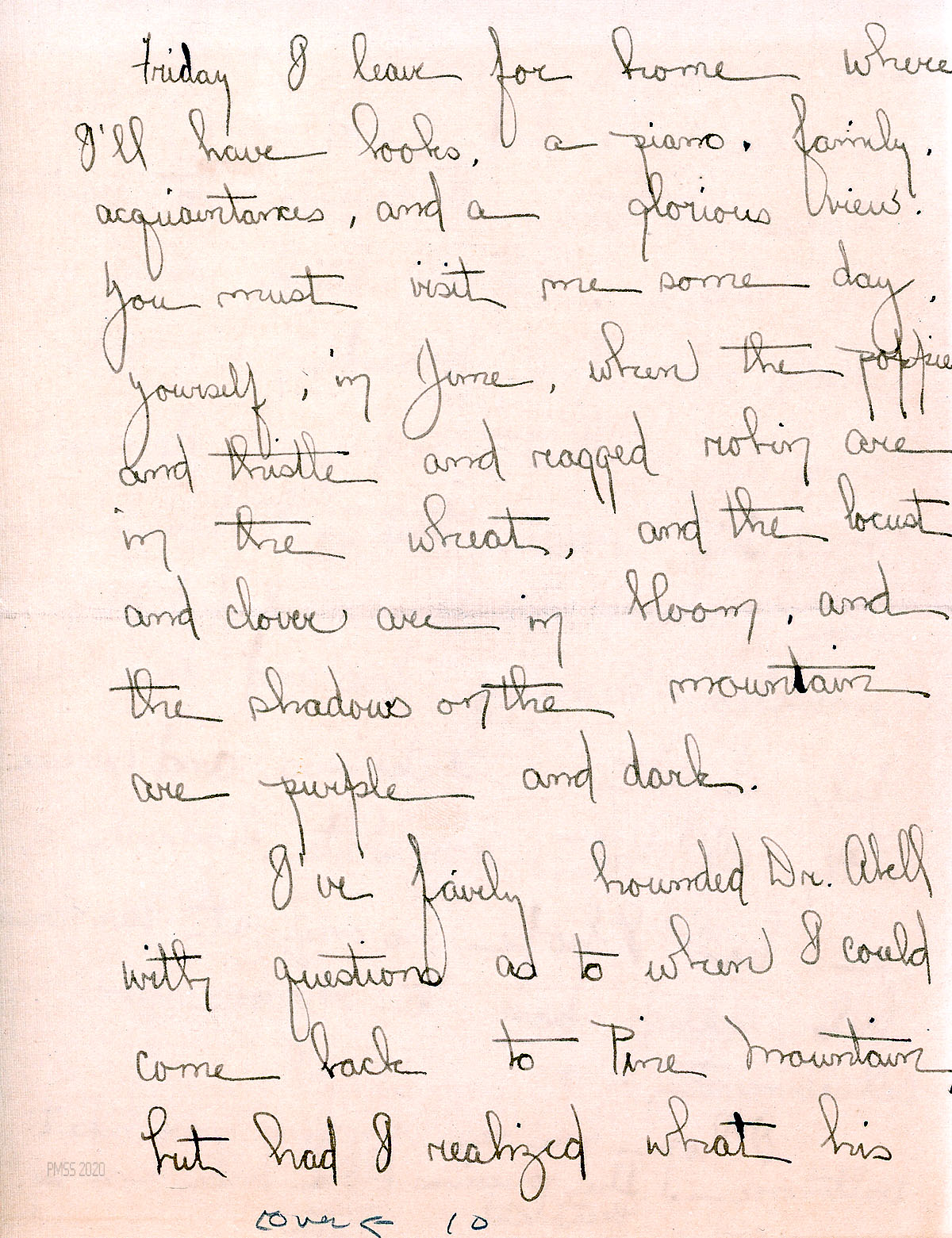 [024] May 5, 1930. Typewritten letter to Mr. Hadley in Venus, TX, from Campbell on PMSS letterhead, stating that she has, after talking with Melville, reconsidered her plans and offered to stay at PMSS past summer to work for the school, if her health permits. She asks to have the responsibility of writing a good many of the letters. “There are very few outside diversions here, and since one’s job is one’s main interest here, I want it to be as live a one as possible.” She relays a message from Miss [Katherine] Pettit concerning hiring a PMSS farmer.