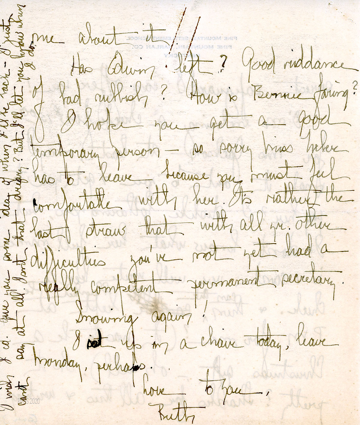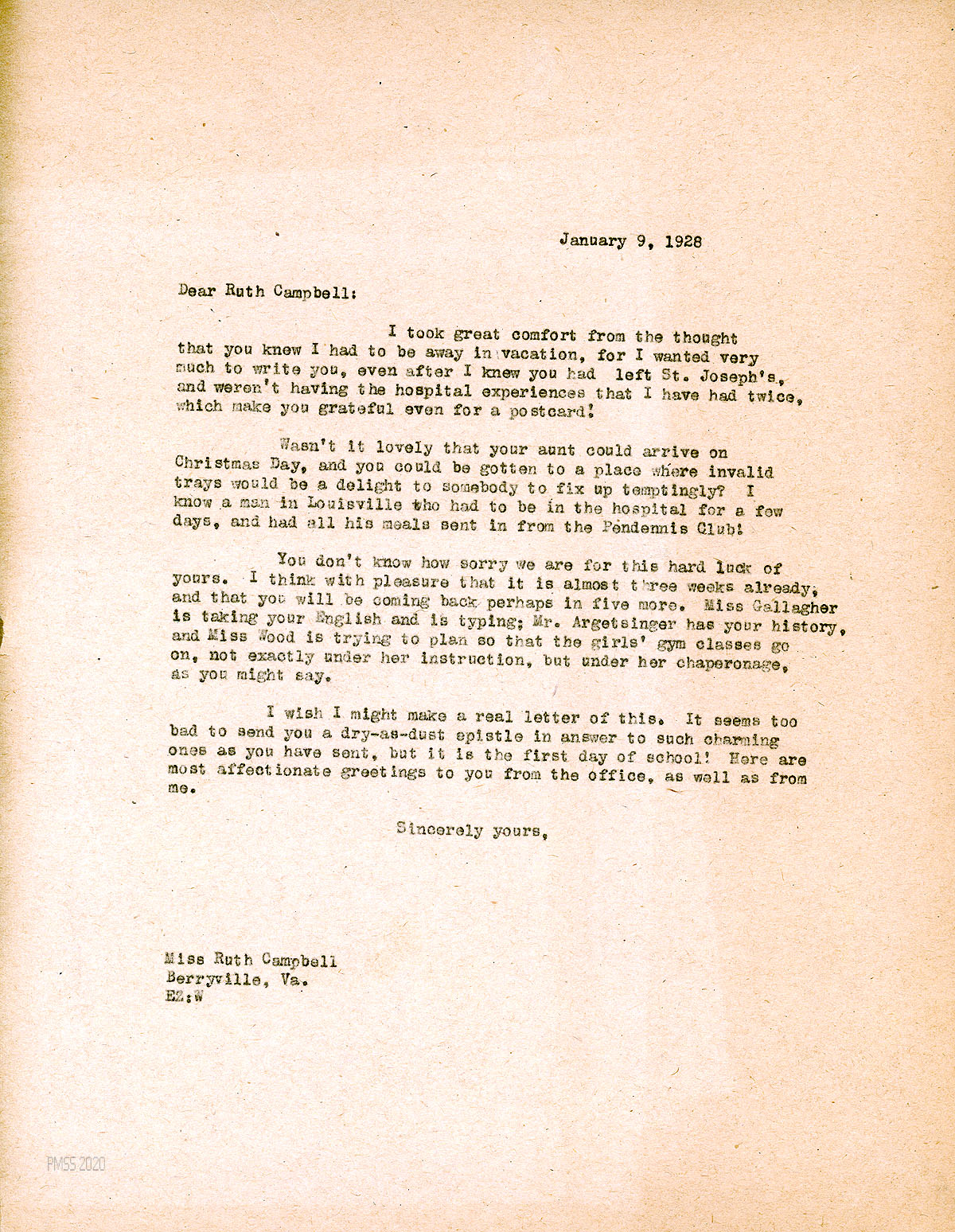 [014] January 9, 1928. to Campbell in Berryville, VA, from EZ [Zande], who is sorry for Campbell’s “hard luck” and looks forward to her return in possibly 5 weeks. Miss Gallagher is taking Campbell’s English classes and typing; Mr. Argetsinger has her history classes and Miss Wood is overseeing the girls’ gym classes.