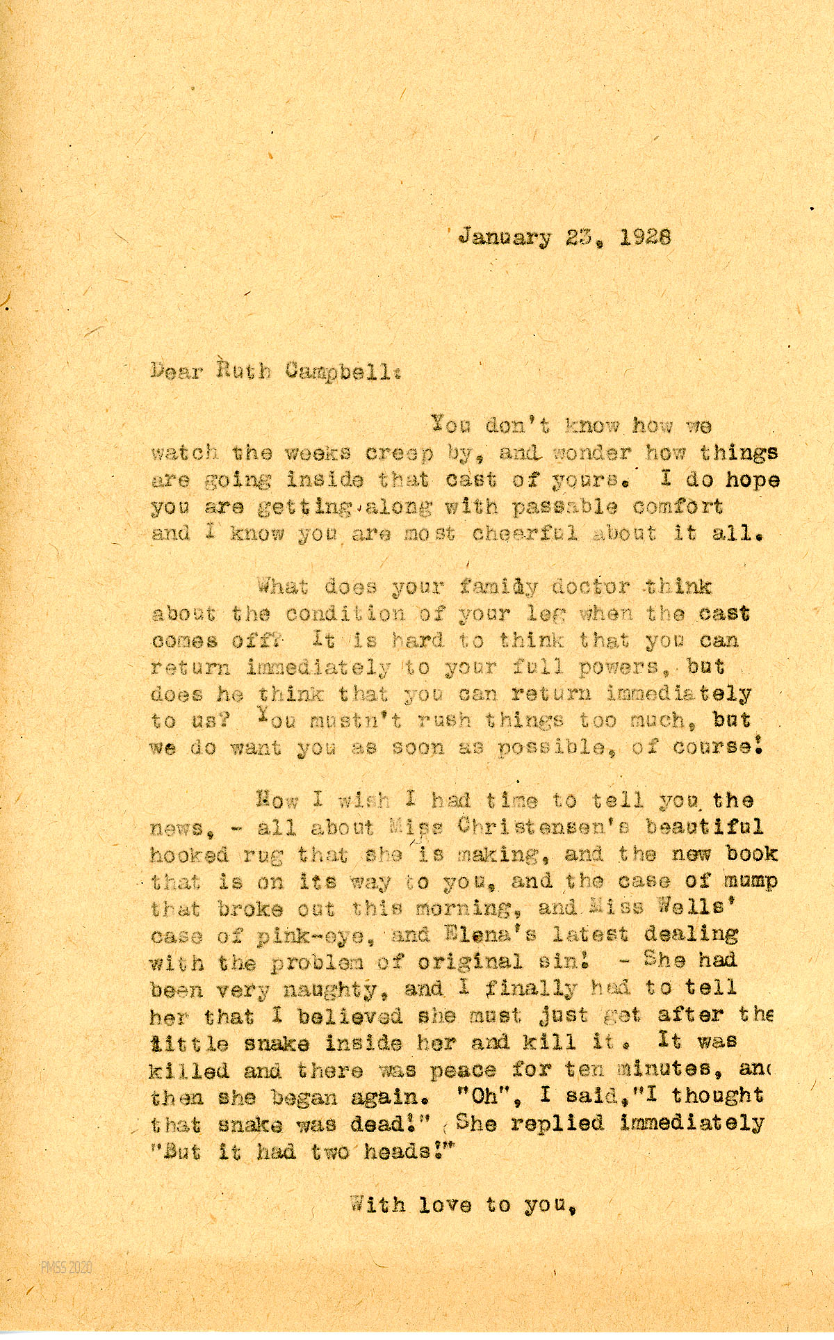 [015] January 23, 1928. to Campbell from [unsigned], who “wonders how things are going inside that cast of yours. I do hope you are getting along with passable comfort and I know you are most cheerful about it all.” Gives PMSS updates, mentioning Miss [Abby] Christensen; mumps; Miss Wells; Elena.