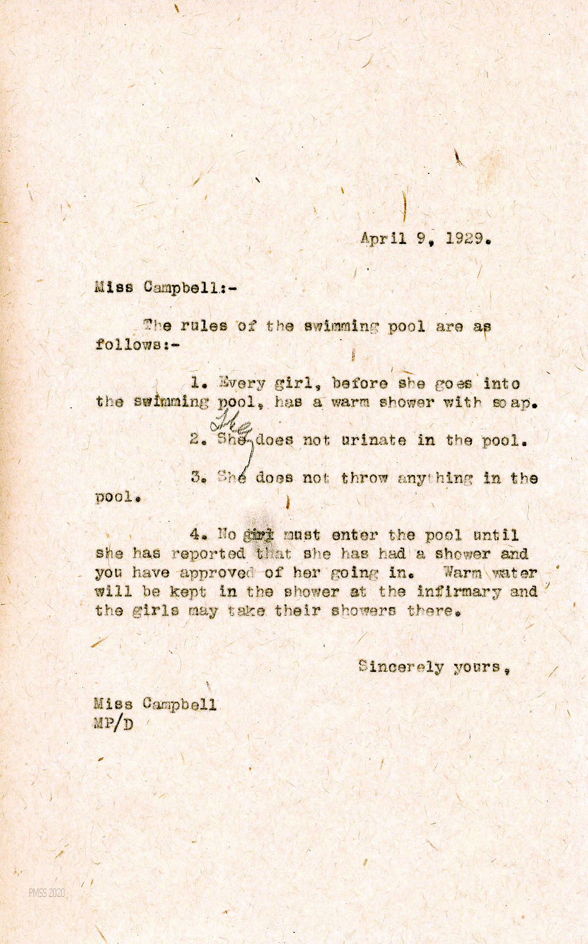 [018] April 9, 1929. To Campbell from MP, stating the rules of the swimming pool, including that every girl has a warm shower with soap in the Infirmary before entering the pool.