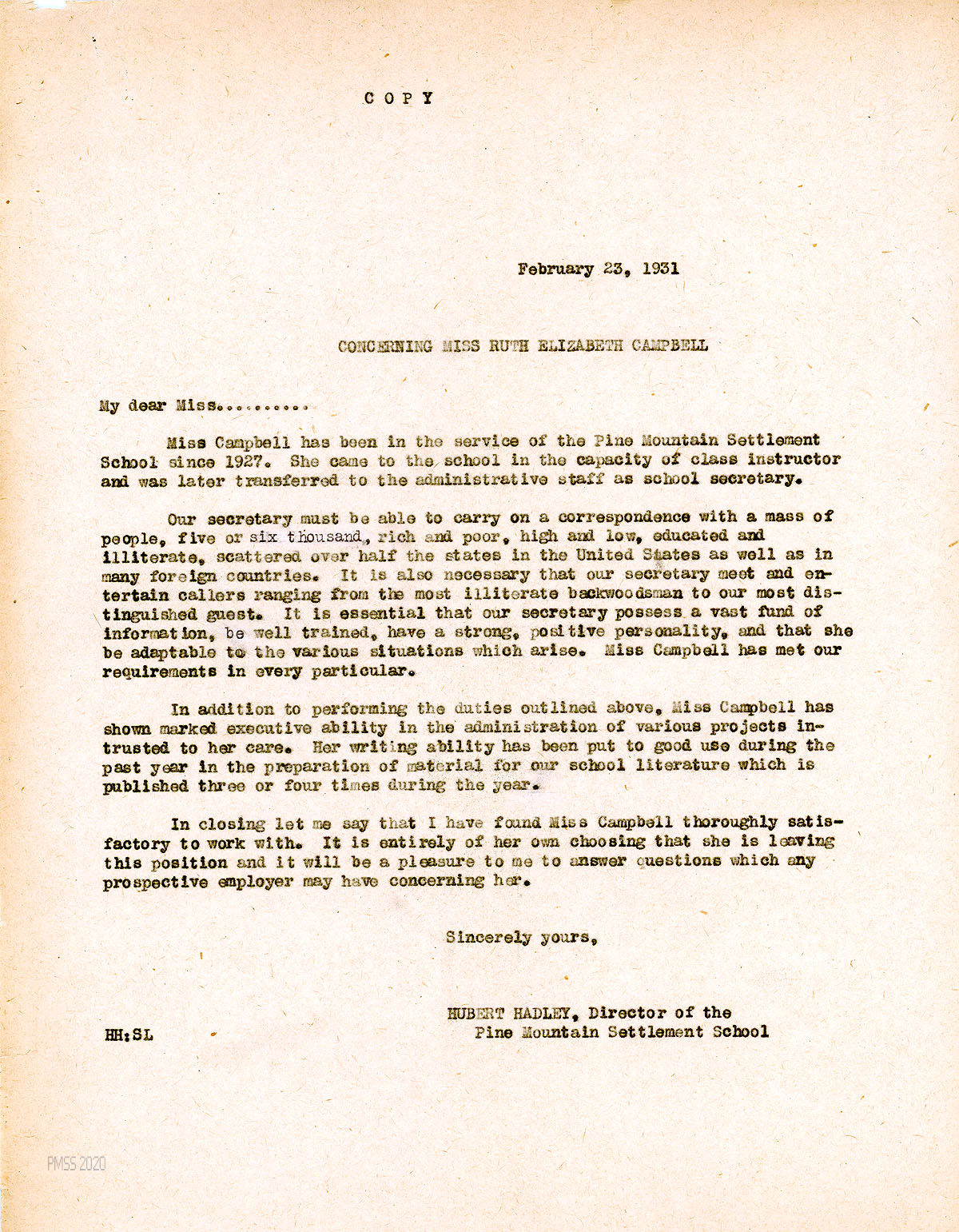 [033] June 9, 1931. To Miss Luke from [unsigned], Secretary, who sends her a “copy of a letter left in the file by Mr. Hubert Hadley, our former Director. Mr. Hadley left the school about April first, and Miss Campbell left around the middle of May.”