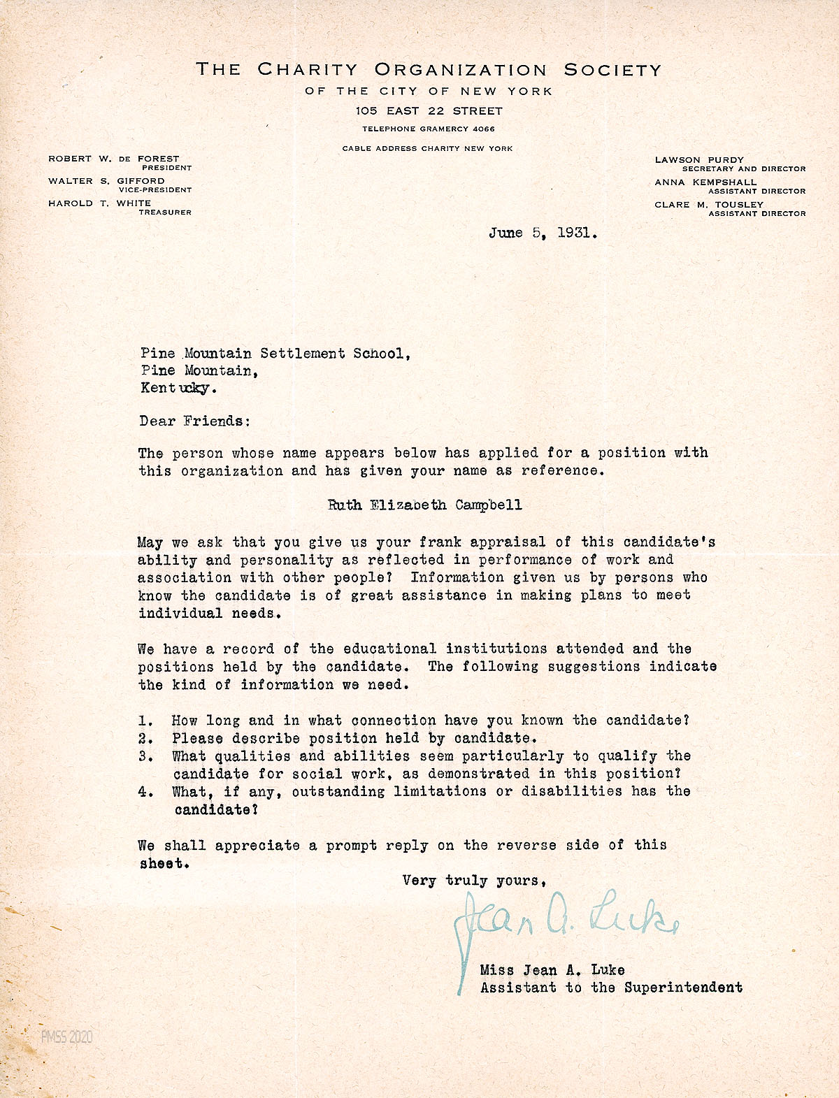 [032] June 5, 1931. To “Friends” at PMSS from Miss Jean A. Luke, Assistant to the Superintendent, on letterhead for “The Charity Organization Society of the City of New York” requesting information about Ruth Elizabeth Campbell who has applied for a position; lists the kind of information required.