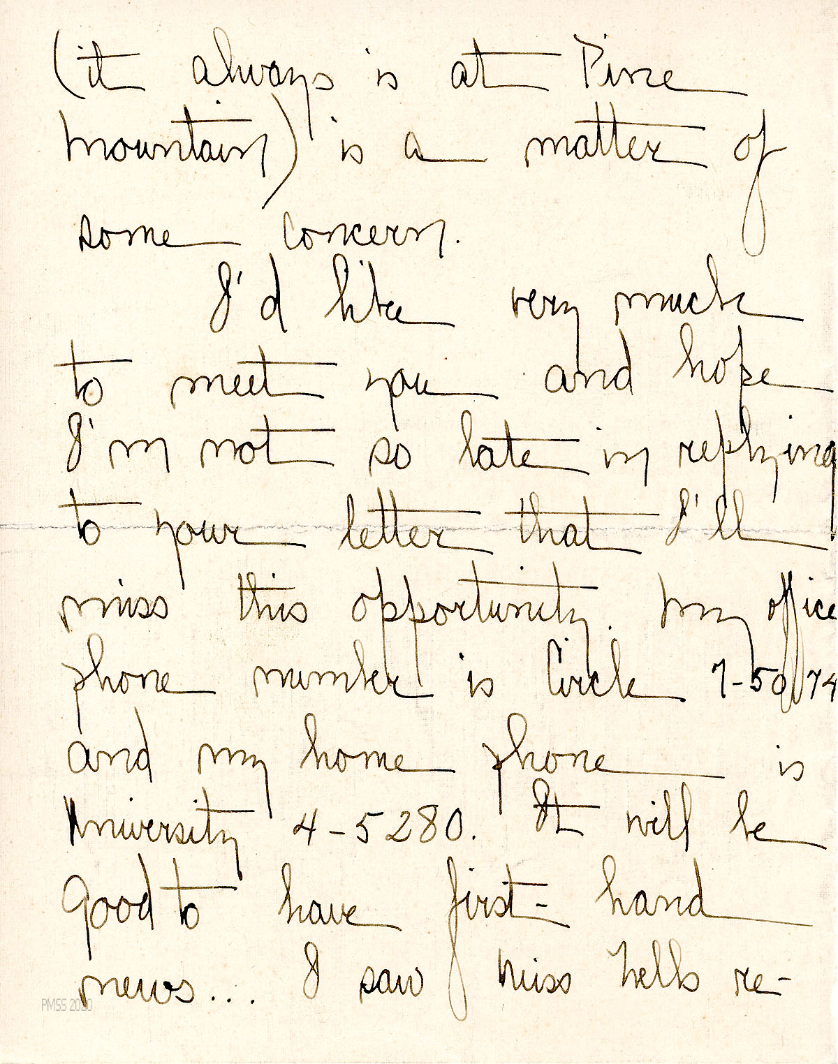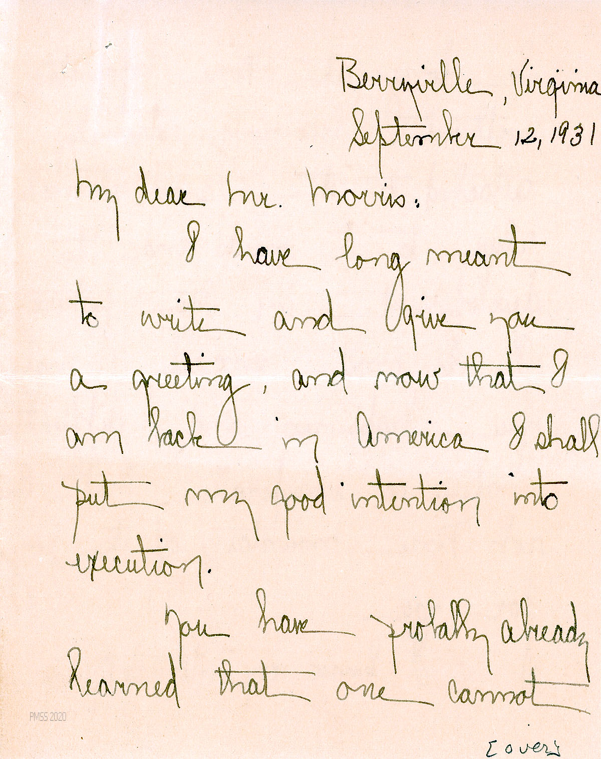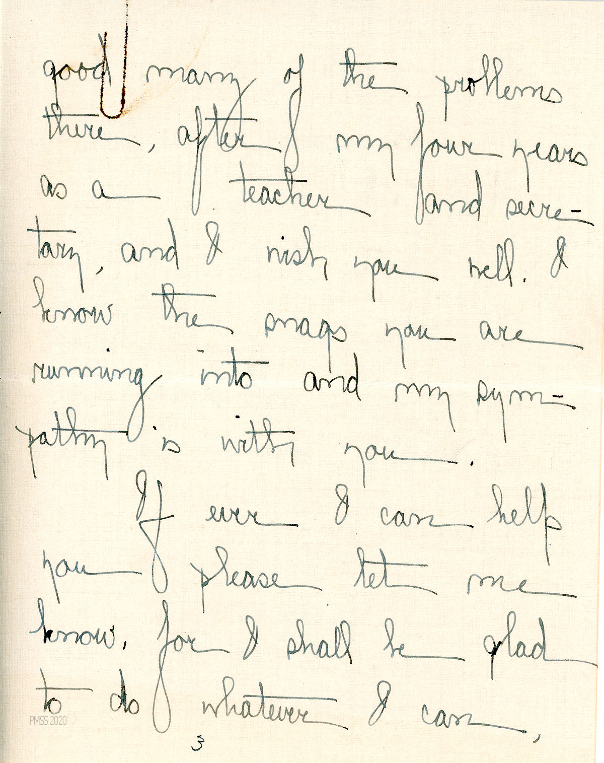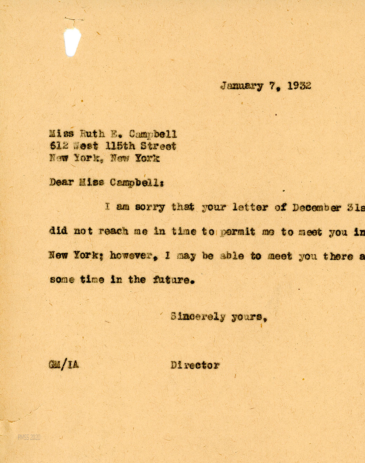 [Note: Letters from PMSS staff in the PMSS Collections are carbon copies, typewritten, unsigned, and meant for the Office files. The original signed copies were sent to the correspondents. The initials at the bottom left of most PMSS letters indicate the writer (along with the initials of the secretary). For example, “GAM” or “GM” refers to Glyn A. Morris, Director. Letters from Ruth Elizabeth Campbell are handwritten unless specified otherwise, and original. The following list of contents is in chronological order and not necessarily in the order of the image numbers.]