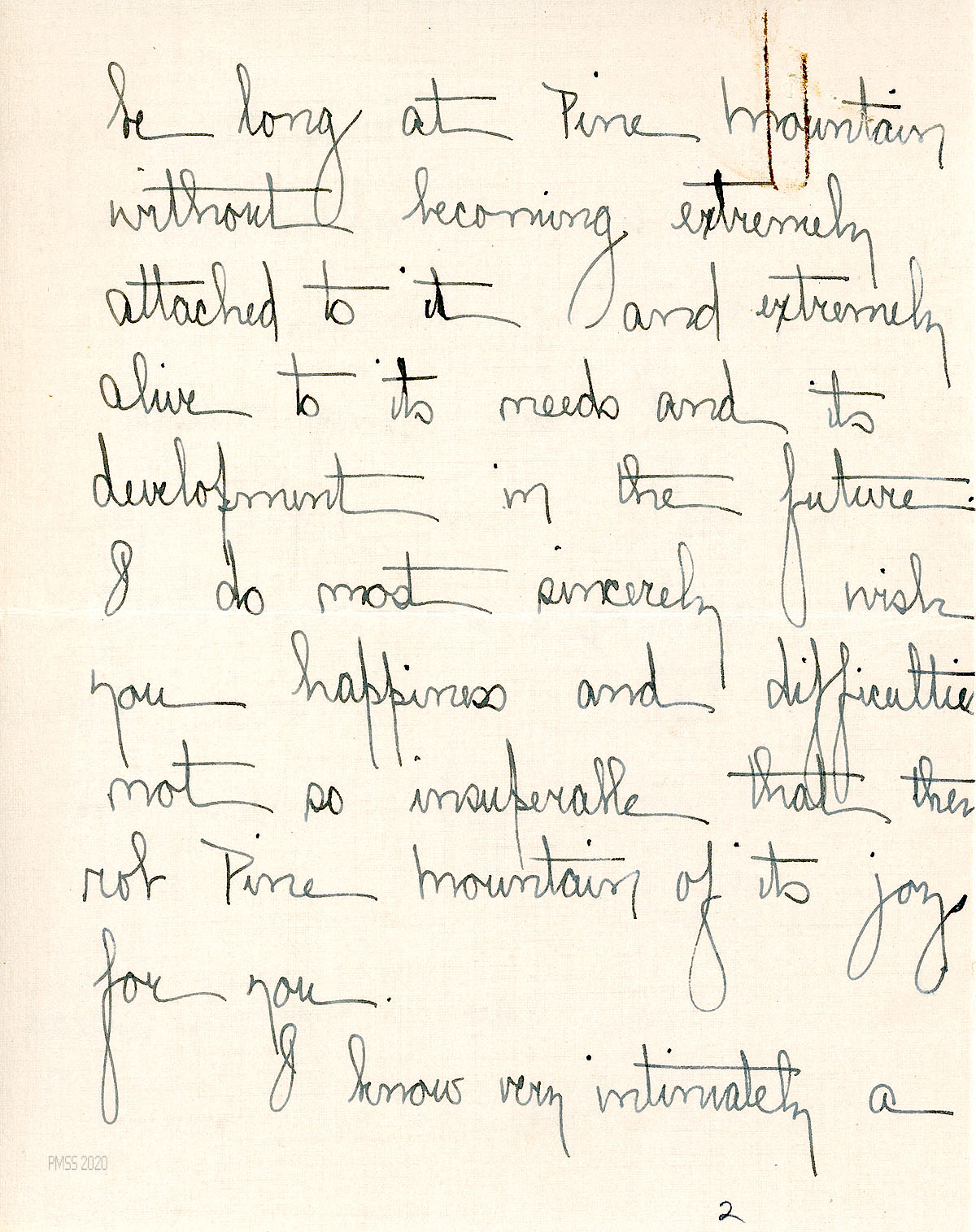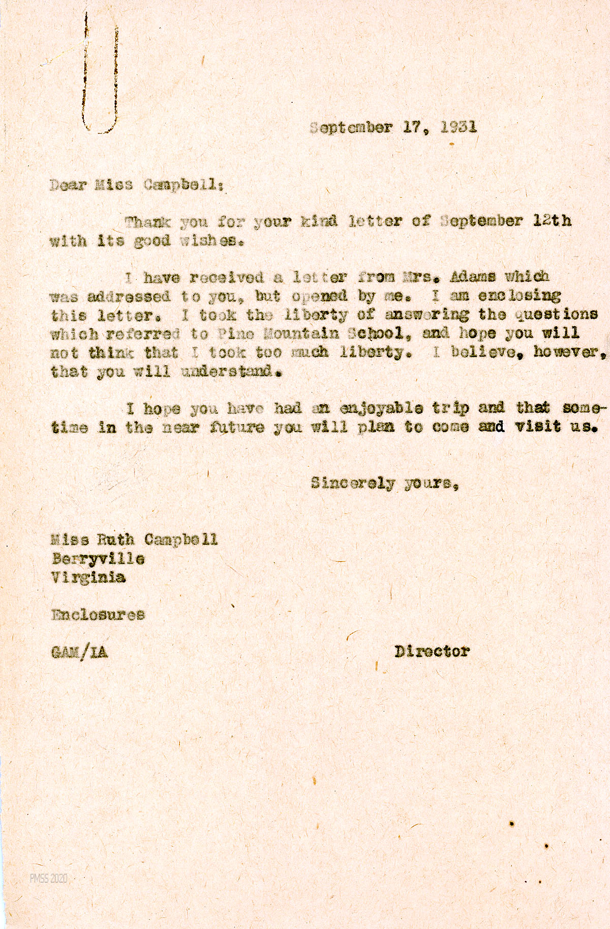 [034] through [034c] September 12, 1931. Four-page letter To Glyn A. Morris, PMSS Director, from Ruth Elizabeth Campbell in Berryville, VA. She mentions she is “back in America” and sends Morris greetings. “You have probably learned that one cannot be long at Pine Mountain without becoming extremely attached to it and extremely alive to its needs and its development in the future. I do most sincerely wish you happiness and difficulties not so insuperable that they rob Pine Mountain of its joys for you. … If ever I can help you please let me know.”
