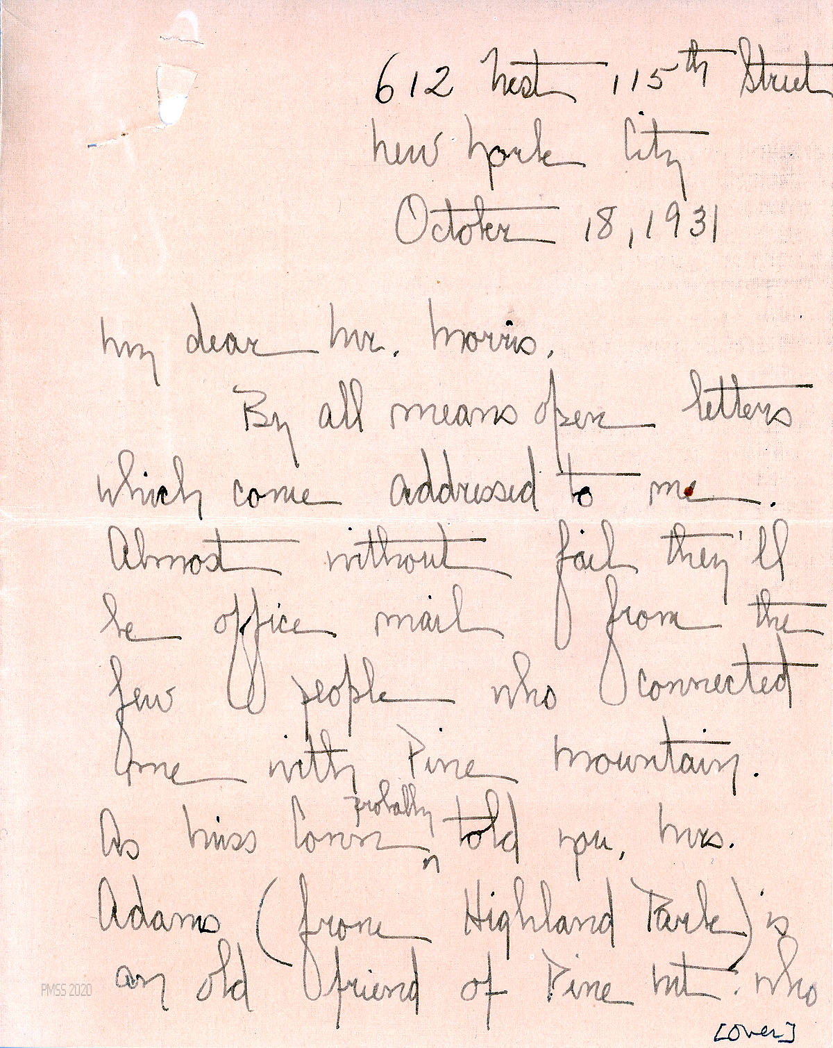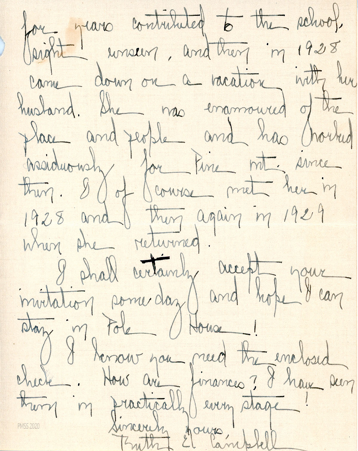 [036], [036a] October 18, 1931. To Morris from Campbell in NYC. “As Miss Conn probably told you, Mrs. Adams (from Highland Park) is an old friend of Pine Mt. who for years contributed to the school, sight unseen, and then in 1928 came down on a vacation with her husband. She was enamoured (sic) of the place and people and has worked assiduously for Pine Mt. since then. I of course met her in 1928 and then again in 1929 when she returned.” She encloses a check and asked about finances: “I have seen them in practically every stage!”