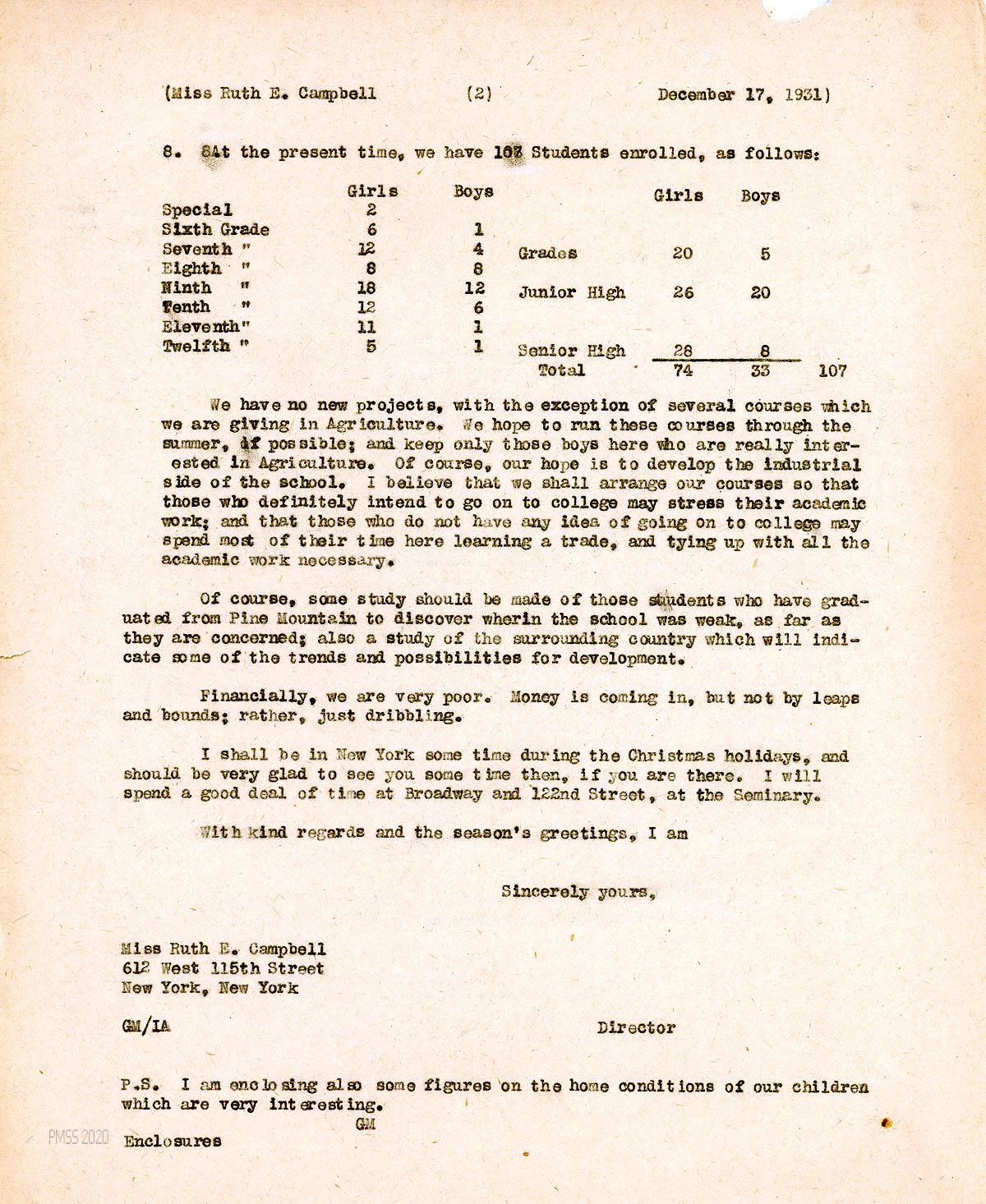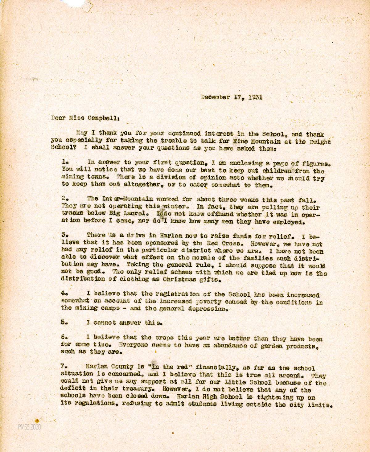 [038], [038a] December 17, 1931. Two-page letter to Campbell from GM (Morris), Director, who thanks Campbell for her “continued interest in the School” and for her talk for PMSS at the Dwight School. Provides answers to her questions concerning accepting children in mining towns; continued operation of Inter-Mountain (pulling up tracks below Big Laurel); efforts to “raise funds for relief”; some increase in School registration (due to “increased poverty in the mining camps and the general depression.”); improved crops this year; financial situation of Harlan County schools (They are “in the red” and PMSS received no support for Little School from them.); numbers of students enrolled (107 total). No new projects, except in Agriculture; hopes to develop industrial education; arranging courses for students interested in college. Studies should be made of graduates and trends in the surrounding country.