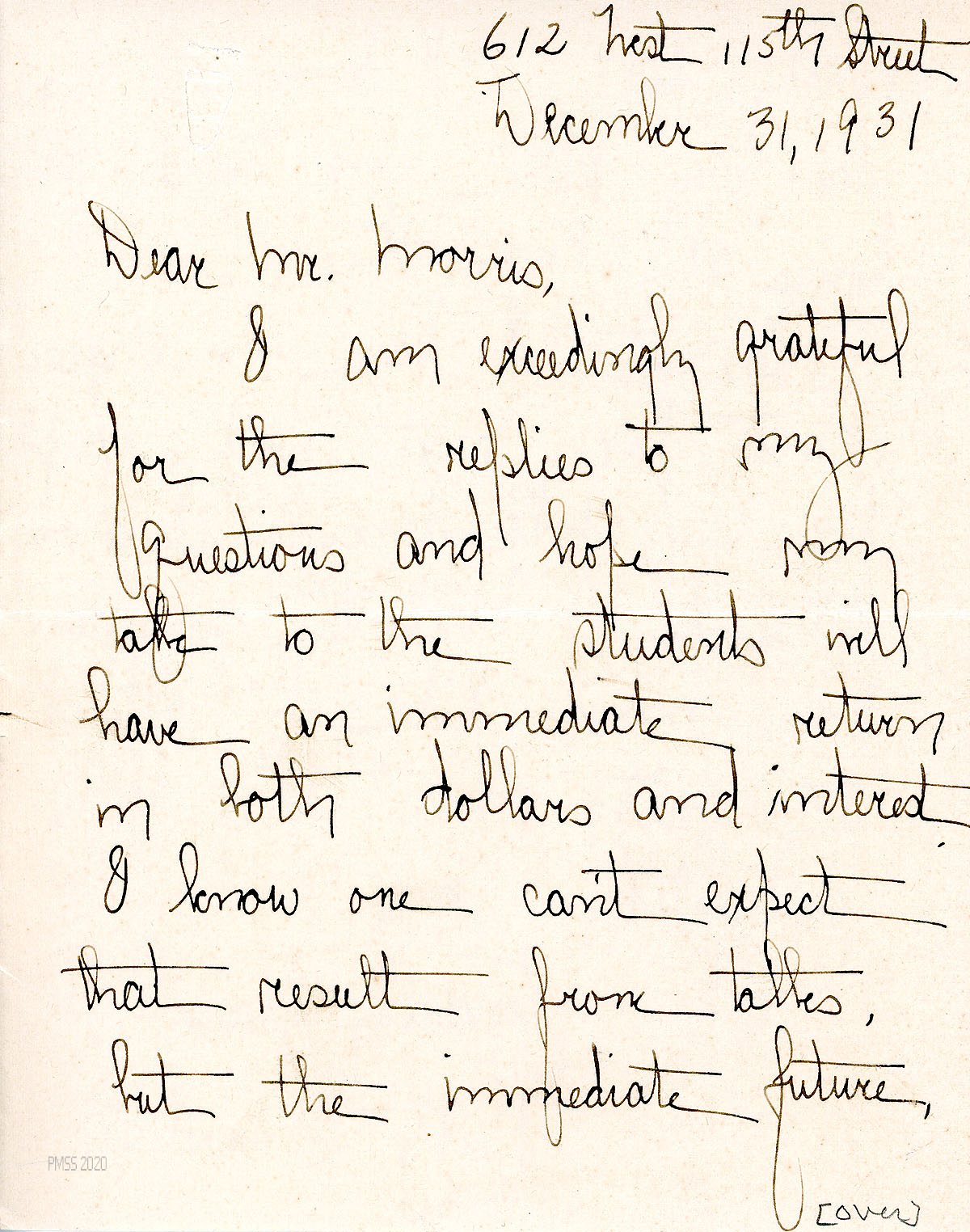 [037] October 22, 1931. To Campbell in NYC from GAM (Morris), Director, thanking her for her check of $5.00. Suggests she visit nearby Union Theological Seminary: “Professor Swift is quite well acquainted with Miss Wells.” About finances, he writes that the School is “keeping at a sort of hand-to-mouth process.”