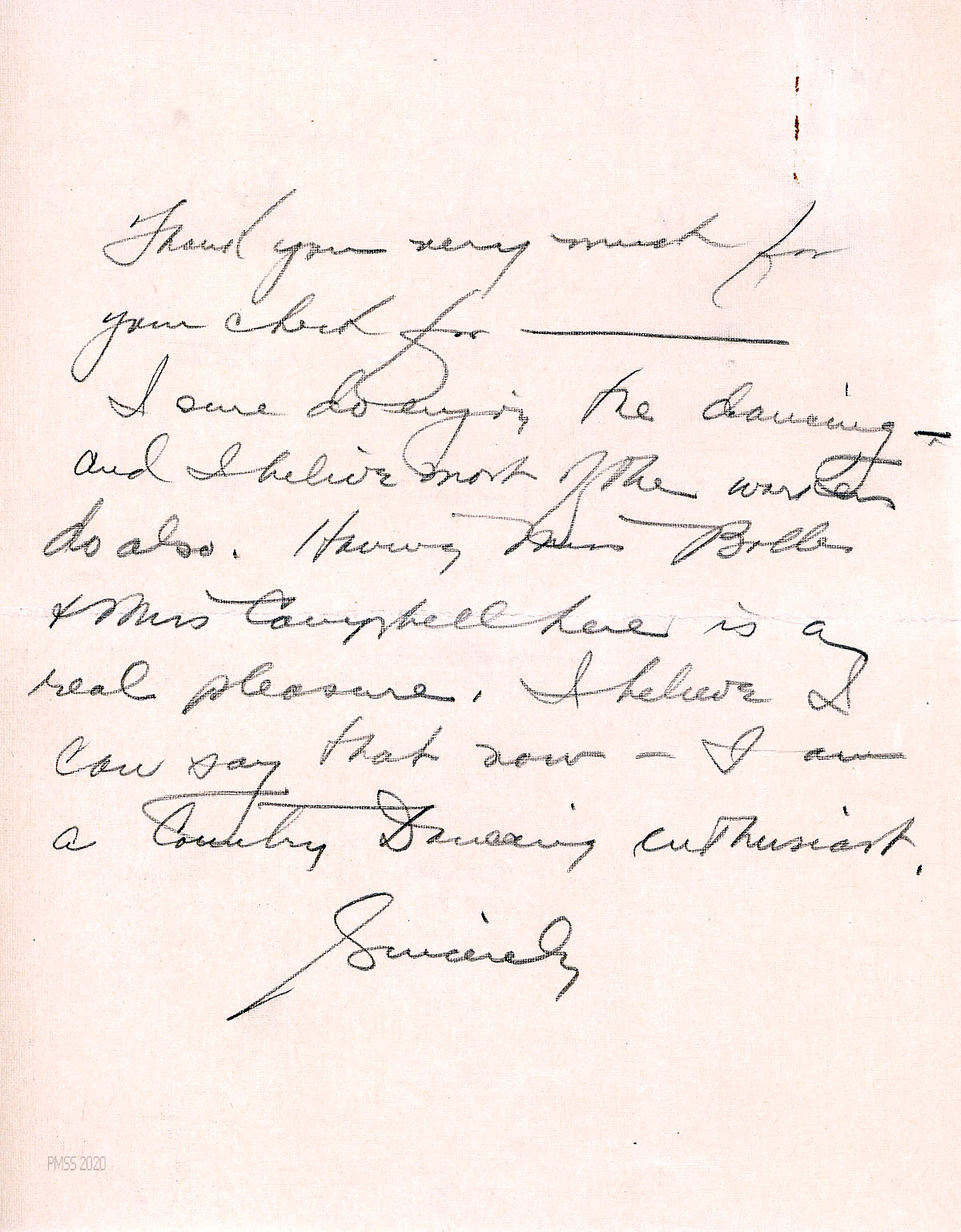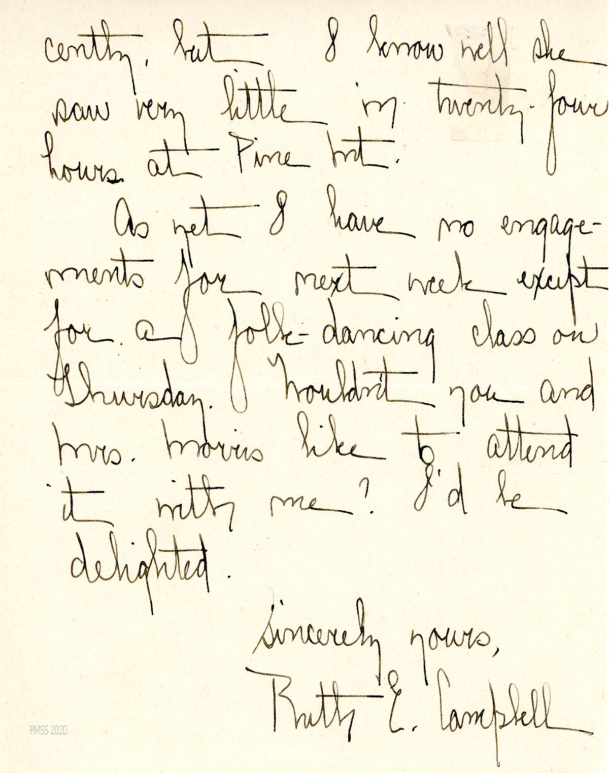 TAGS: Ruth Elizabeth Campbell, correspondence II, Glyn A. Morris, PMSS finances, fundraising talks, donations, country dancing, New York City, Mrs. Adams