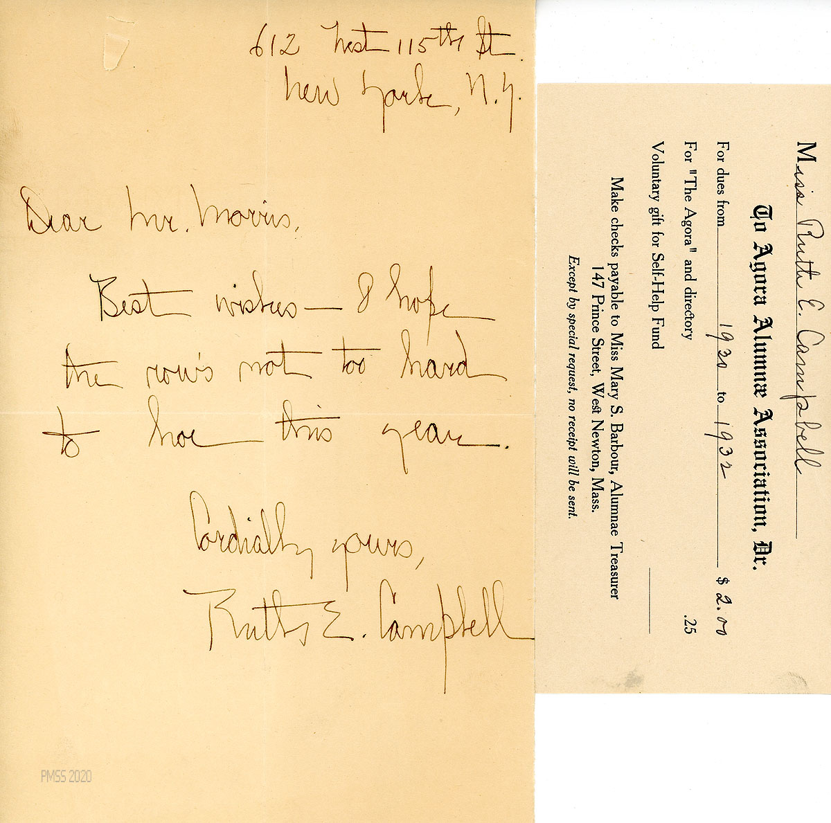 [042] N.D. To Morris from Campbell, hoping that “rows [are] not too hard to hoe this year.” Attached: card indicating $2.00 for 1930-32 dues to the “Agora Alumnae Association.”