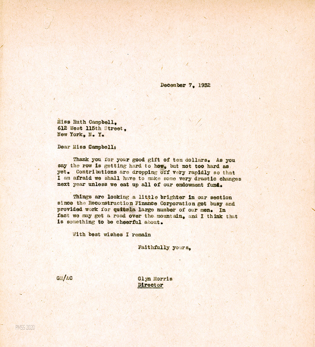 [043] December 7, 1932. To Campbell from Morris, thanking her for her $10.00 gift. “Contributions are dropping off very rapidly so that I am afraid we shall have to make some very drastic changes next year unless we eat up all of our endowment fund.” The Reconstruction Finance Corporation has provided work for a large number of area men; a road over the mountain may be built.