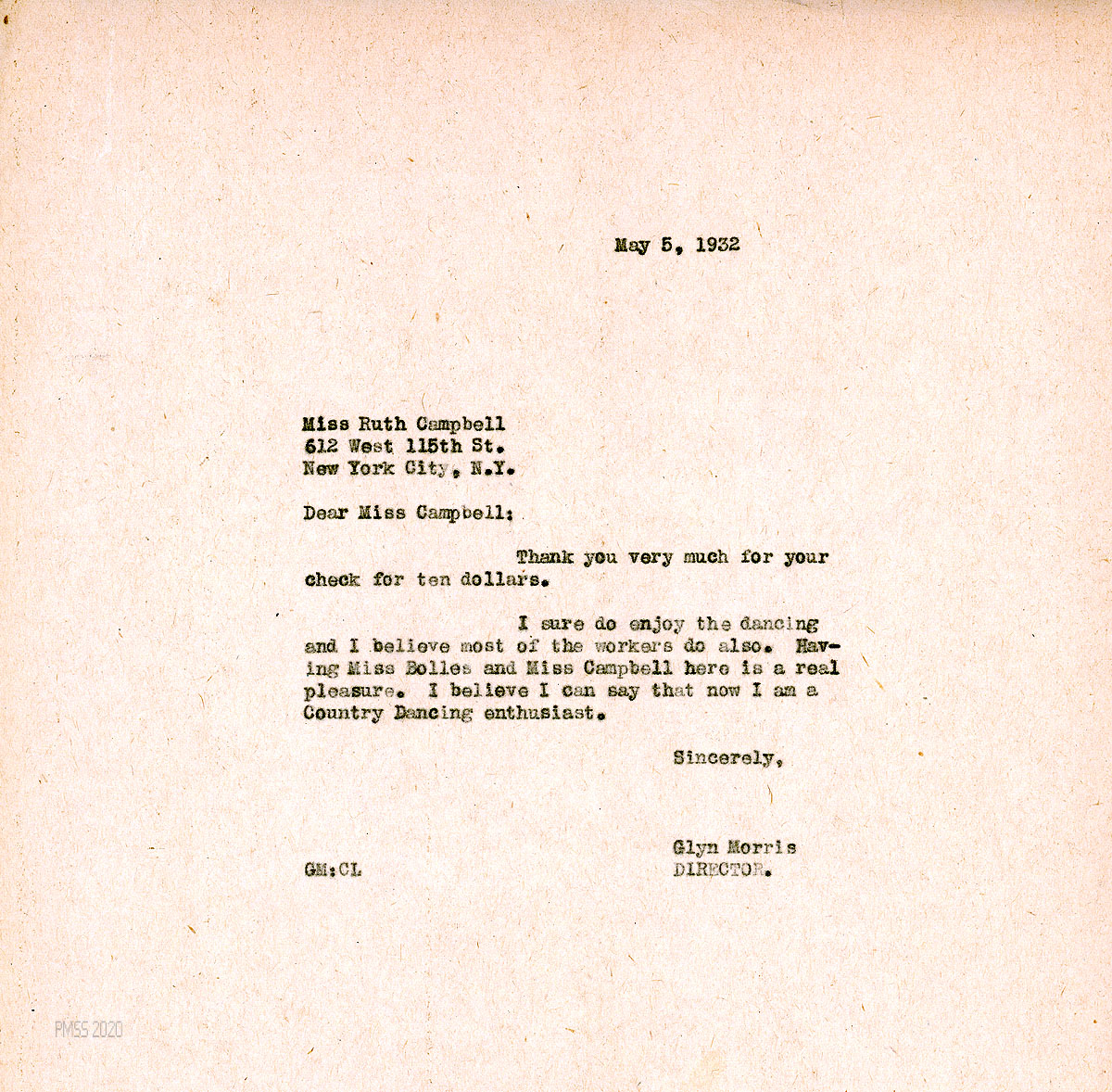 [045] May 5, 1932. To Campbell from Morris. [The text in this typewritten letter duplicates the handwritten draft [044a]). Morris thanks Campbell for her $10.00 check and describes his enthusiasm for Country Dancing. “Having Miss [Dorothy] Bolles & Mrs. [John C.] Campbell here is a real pleasure.”