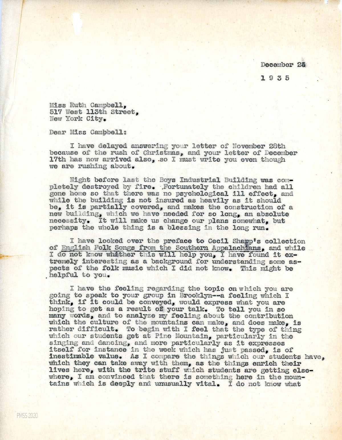 [029], [029a] December 23, 1935. Two-page letter to Campbell in NYC from [unsigned, possibly Glyn Morris], responding to Campbell’s letters of November 28 and December 17. Describes the burning down of the Boys Industrial Building, which was partially covered by insurance “and makes the construction of a new building, which we have needed for so long an absolute necessity.” Suggests that the preface to Cecil Sharp’s collection of English Folk Songs from the Southern Appalachians may be helpful to Campbell.