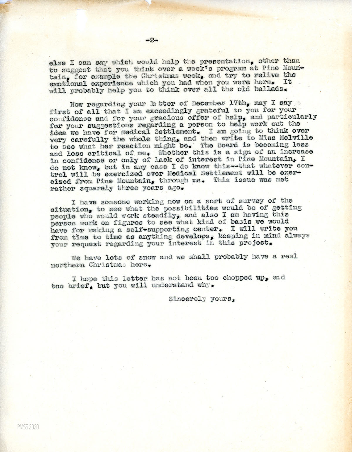 In response to Campbell’s December 17 letter: He appreciates her offer to help and her suggestions “regarding a person to help work out the idea we have for Medical Settlement.” He will also consult Miss Melville. “The board is becoming less critical of me…. [W[hatever control will be exercised over Medical Settlement will be exercised from Pine Mountain, through me. This issue was met rather squarely three years ago.” He has a person researching the possibilities for making the center self-supporting.