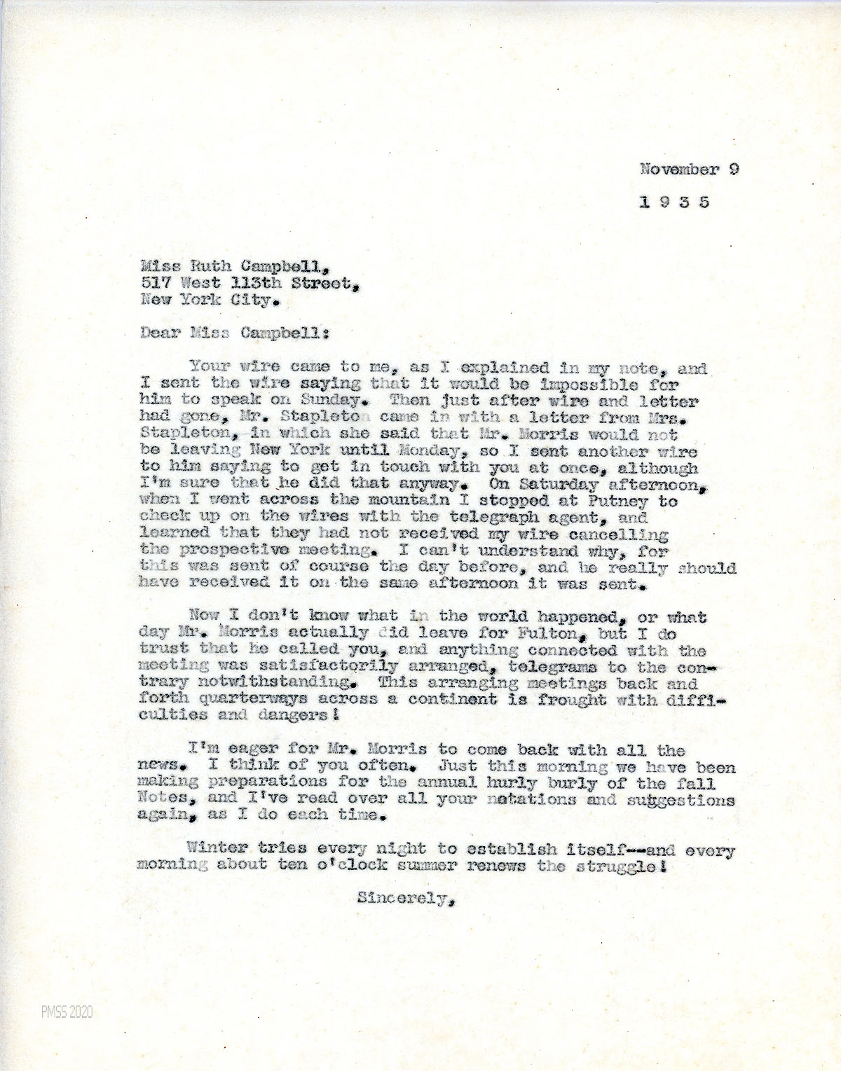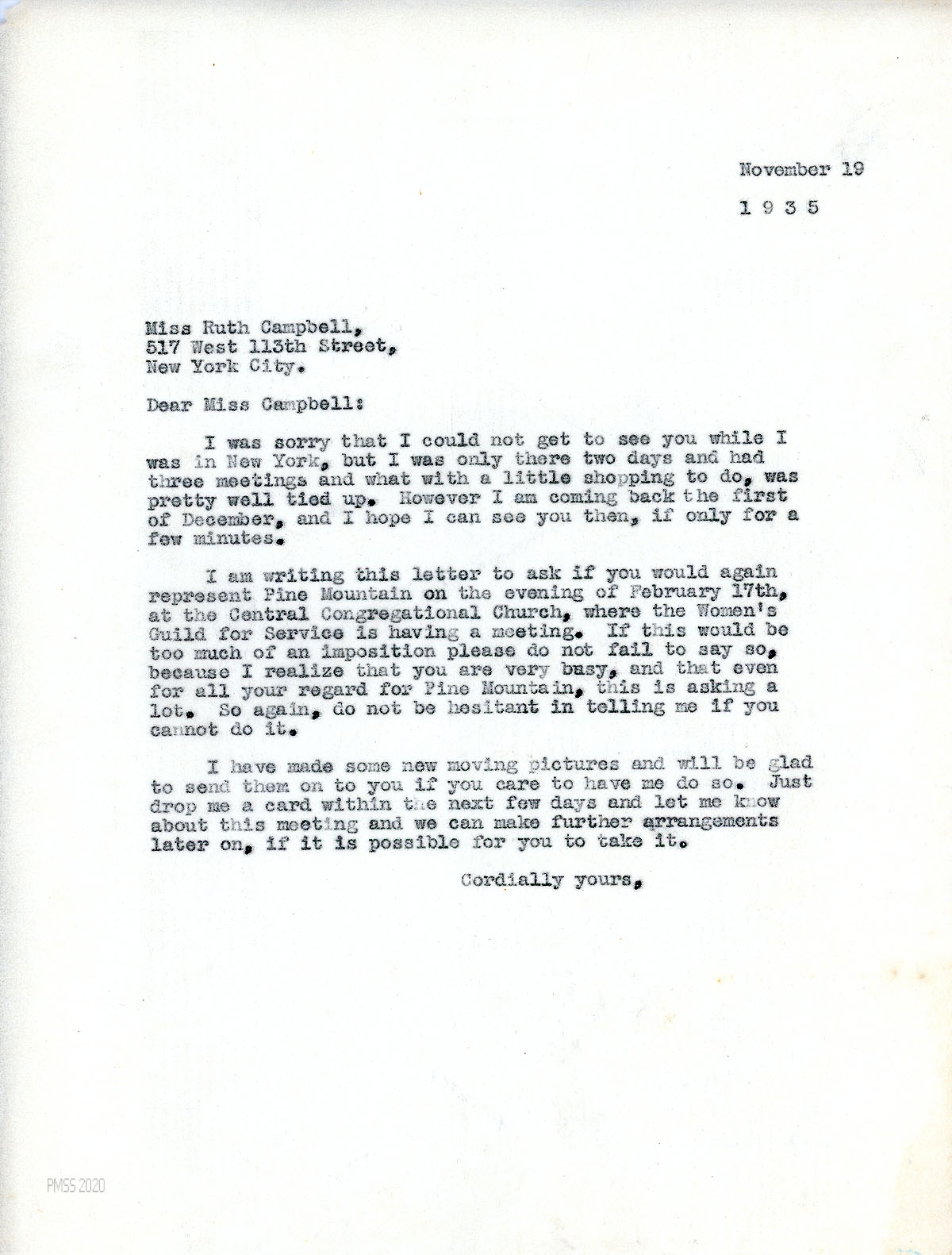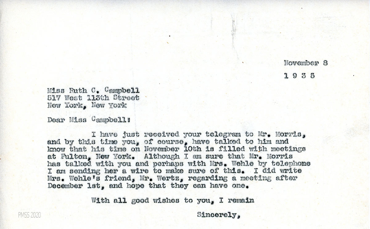 [092] November 19, 1935. To Campbell from [unsigned, apparently Morris], who regrets not seeing Campbell while in NY; will return in December and hopes for a visit with her. Asks Campbell to speak about PMSS to the Women’s Guild for Service at the Central Congregational Church. He has made some new “moving pictures” that he can send.