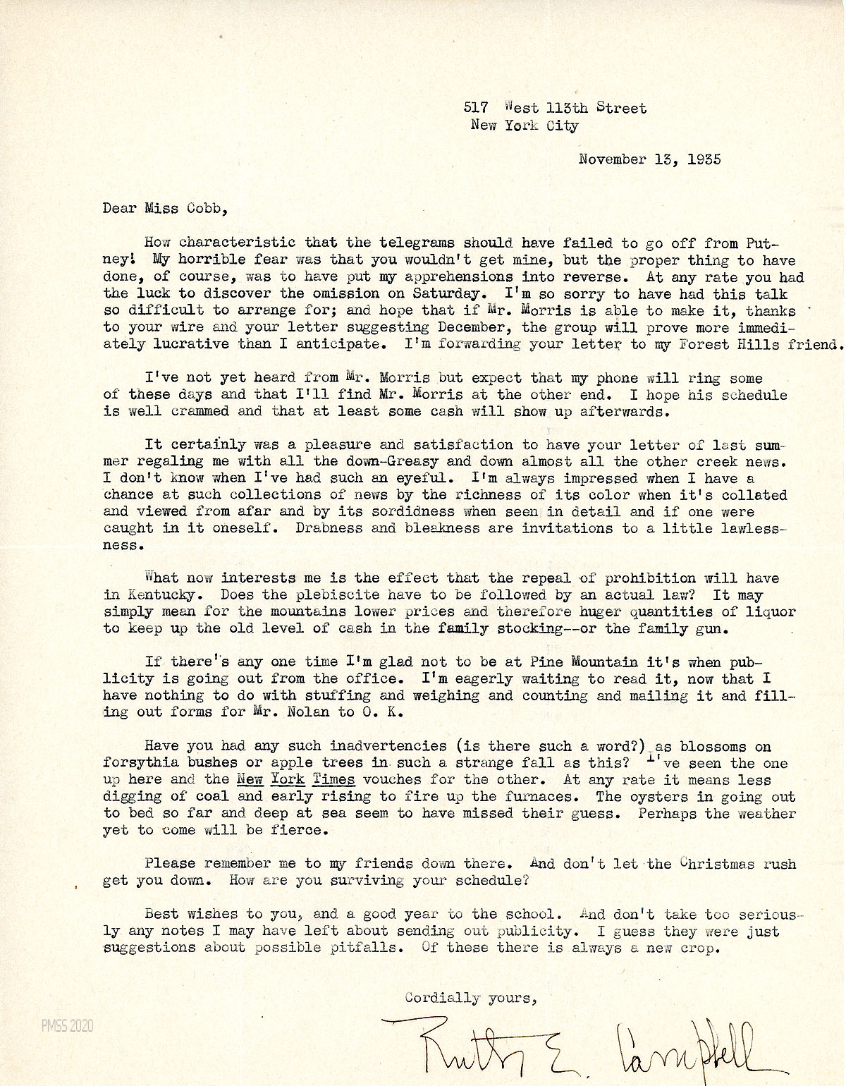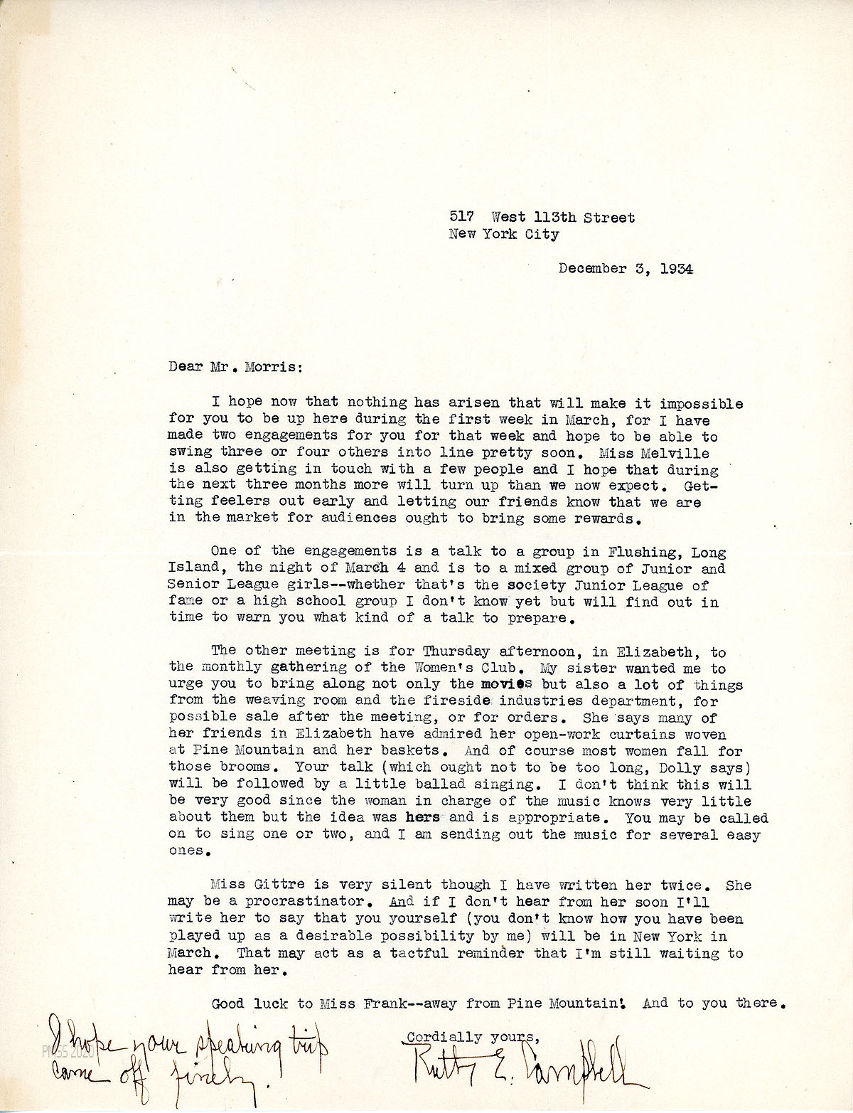 [062] December 3, 1934. To Morris from Campbell, who is lining up speaking engagements for Morris in NYC in March. One engagement is a talk to the Junior and Senior League in Flushing, Long Island. Another is to the Women’s Club in Elizabeth [NJ] and suggests a sale of fireside industries items and ballad singing after the meeting.