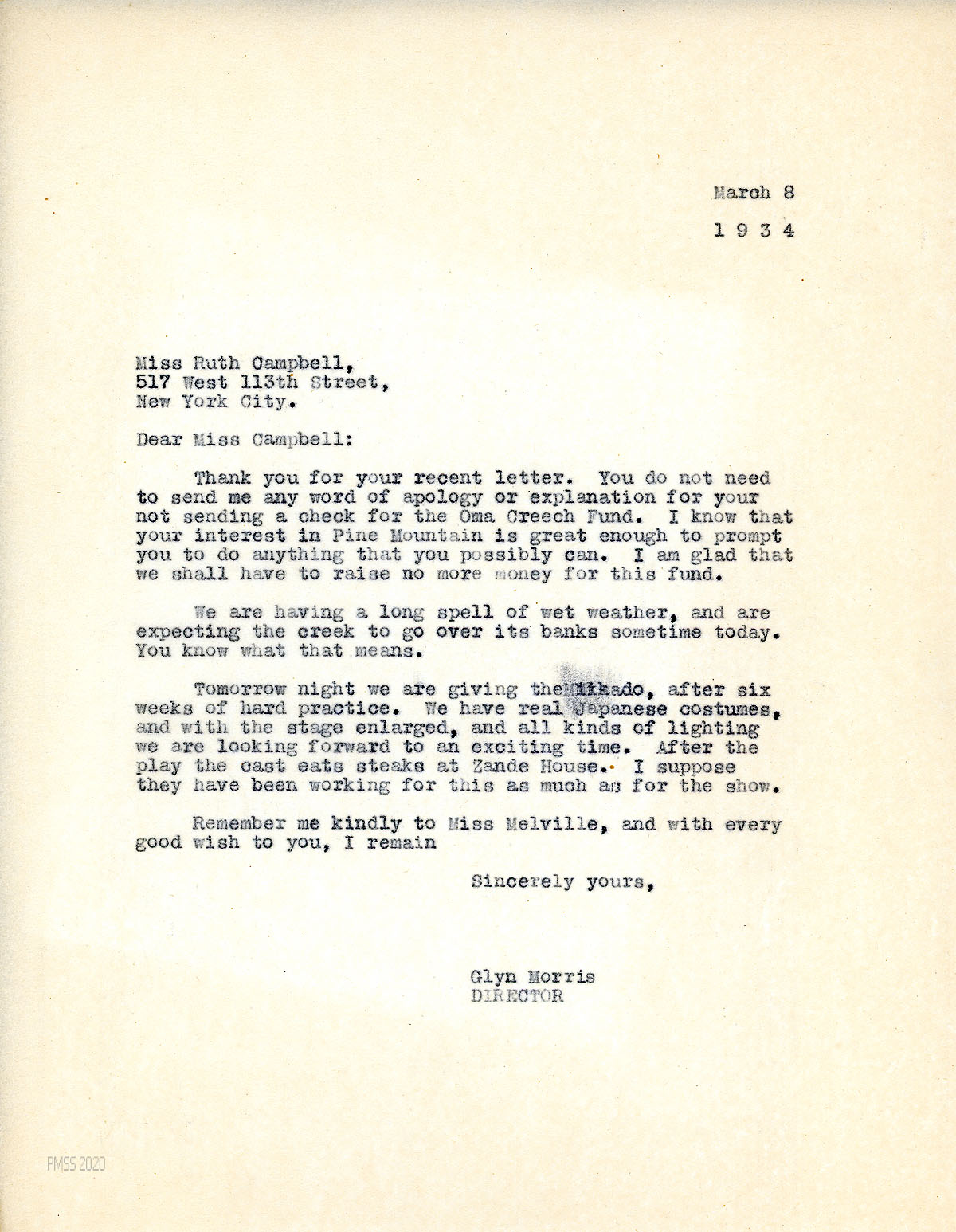[047] March 8, 1934. To Campbell from Morris, who thanks her for her letter and tells her there is no need to apologize: “I know that your interest in Pine Mountain is great enough to prompt you to do anything that you possibly can.” The School is presenting the Mikado with real Japanese costumes, an expanded stage, and lighting. “After the play the cast eats steaks at Zande House. I suppose they have been working for this as much as for the show.”