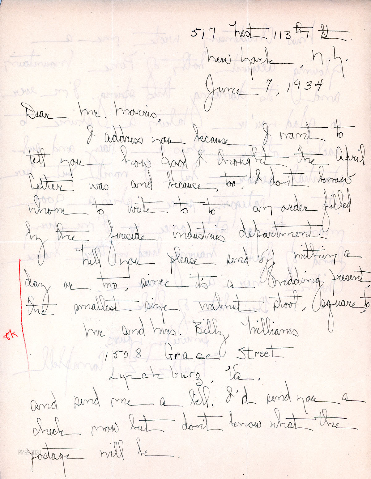 [048] June 7, 1934. To Morris from Campbell, who praises the April Letter and sends an order to the Fireside Industries department for a small walnut stool.
