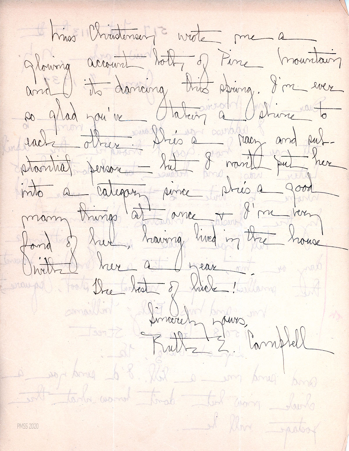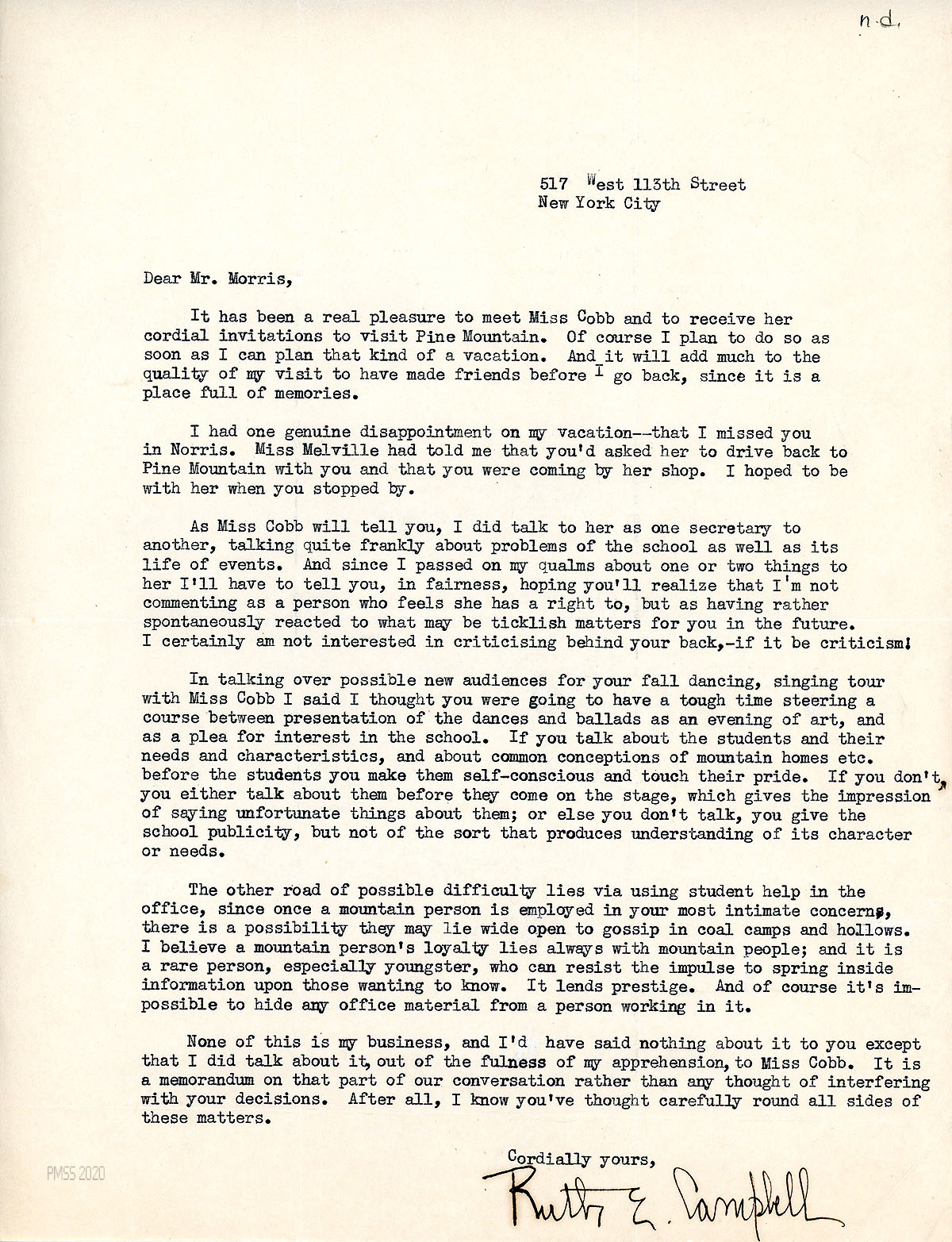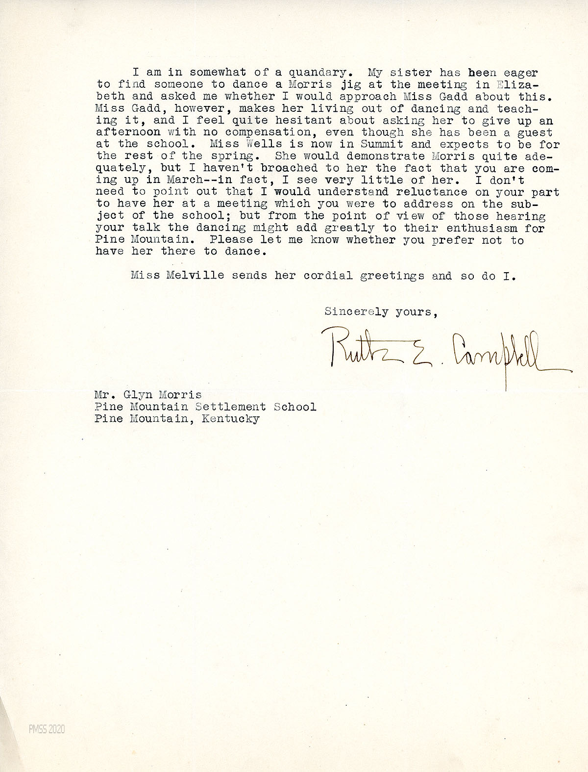 Morris gives his thoughts about Campbell’s topic for a speech before a Brooklyn group concerning “the contribution which the culture of the mountains can make. … [T]he type of thing which our students get at Pine Mountain, particularly in the singing and dancing, and more particularly as it expresses itself for instance in [Christmas week] … is of inestimable value. … There is something here in the mountains which is deeply and unusually vital.” He suggests, for her speech, that Campbell recall a week’s program at PMSS, such as Christmas, and the emotions she experienced; also consider all the old ballads.