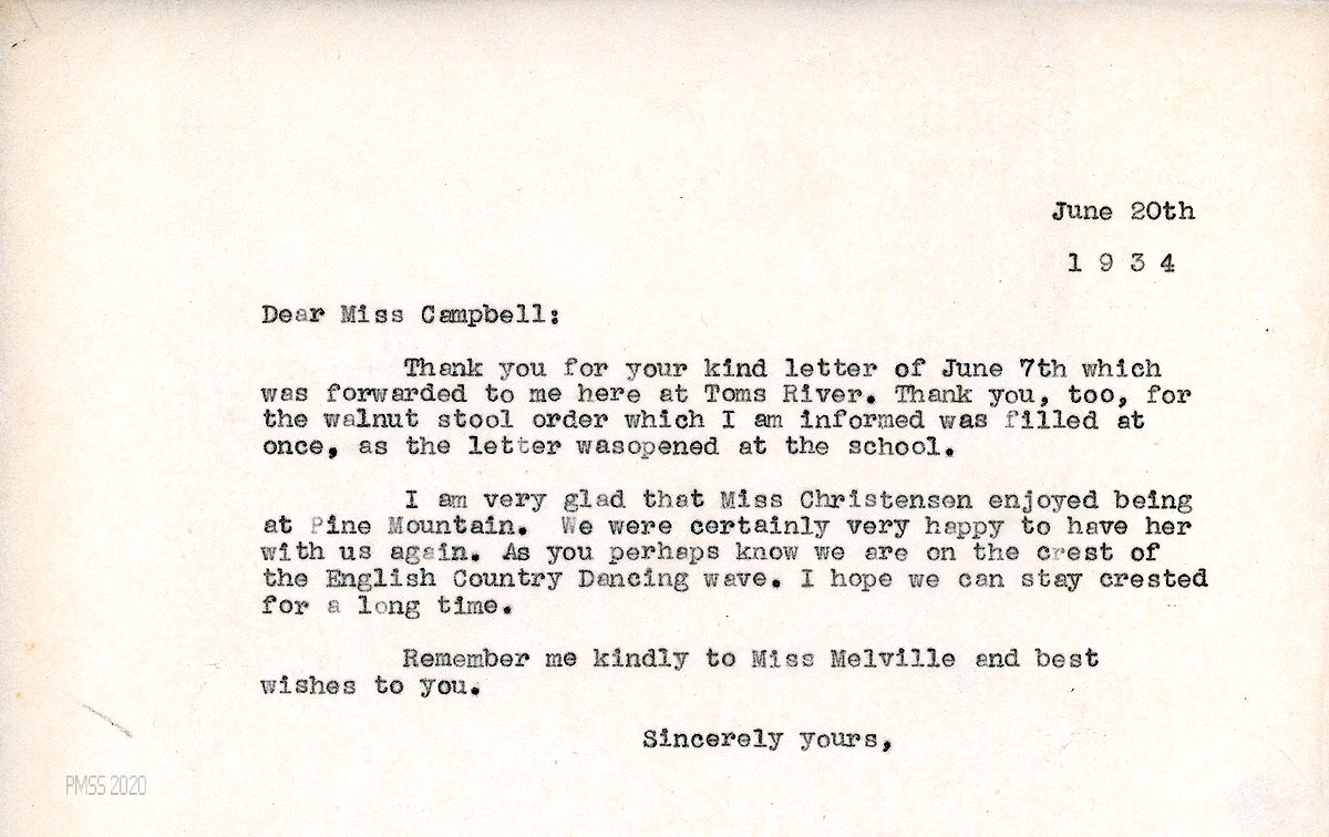 [049] June 20, 1934. To Campbell from [unsigned, apparently Morris], thanking Campbell for her June 7th letter (forwarded to him at Toms River) and the order. Mentions Miss [Abby] Christensen’s visit. “…[W]e are on the crest of the English Country Dancing wave. I hope we can stay crested for a long time. … Remember me kindly to Miss [Angela] Melville….”