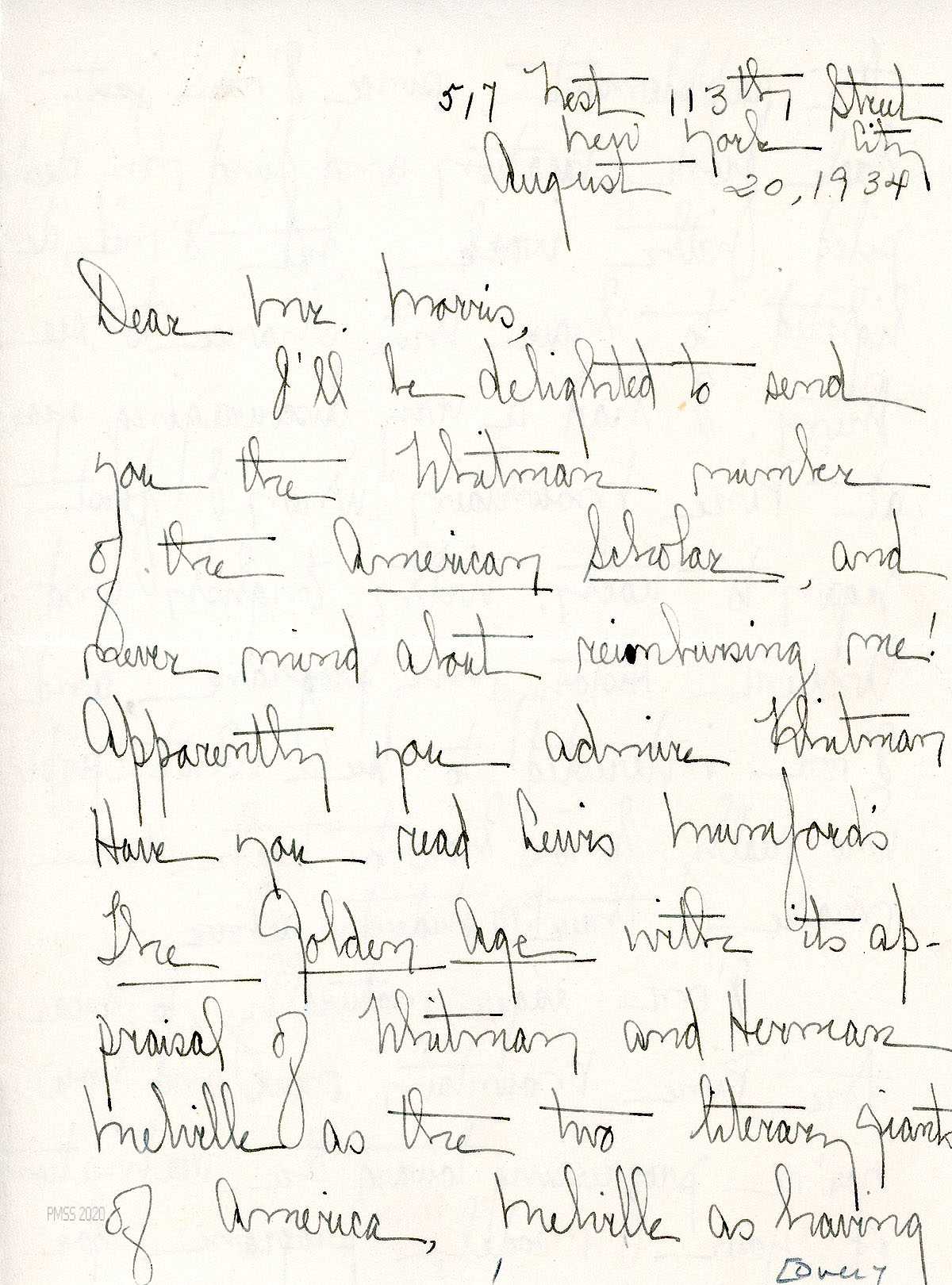 [050] July 31, 1934. To Campbell from [unsigned, apparently Morris], asking Campbell to send an issue of the The American Scholar with articles on Walt Whitman that he wishes to keep for his files; asks for suggestions of places in NYC that he might speak about PMSS.