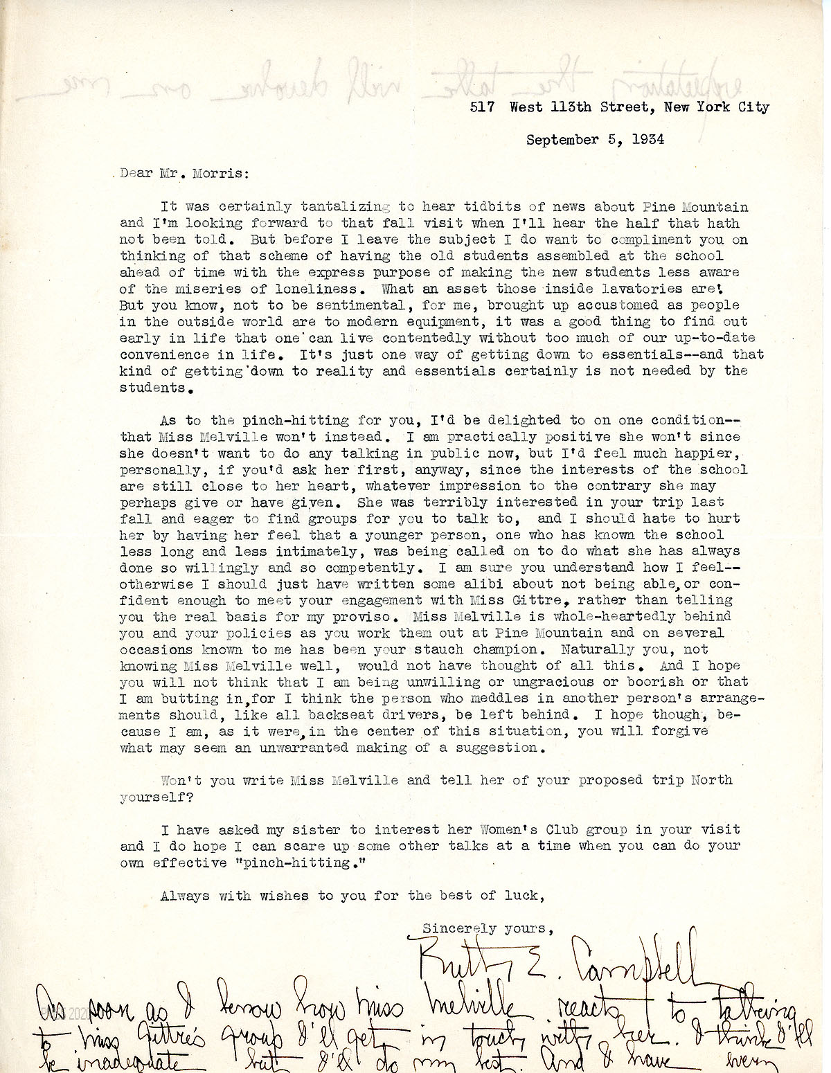 [053] September 5, 1934. To Morris from Campbell, who responds to the topics in his last letter. She agrees to be the speaker (at the Business Women’s Club) but asks Morris to invite Miss Melville first, who is more experienced. However, Melville probably won’t accept “since she doesn’t want to do any talking in public now….” but she is very devoted to the School and “has been your staunch champion.” (Handwritten note at the bottom of the page about Campbell’s speaking if Melville declines.)
