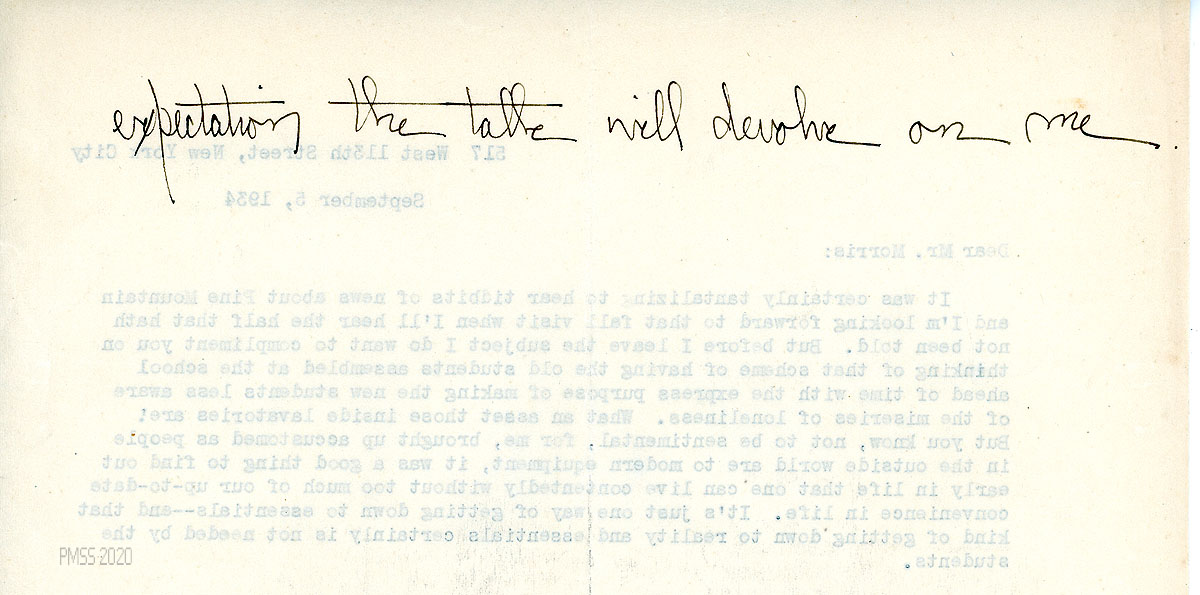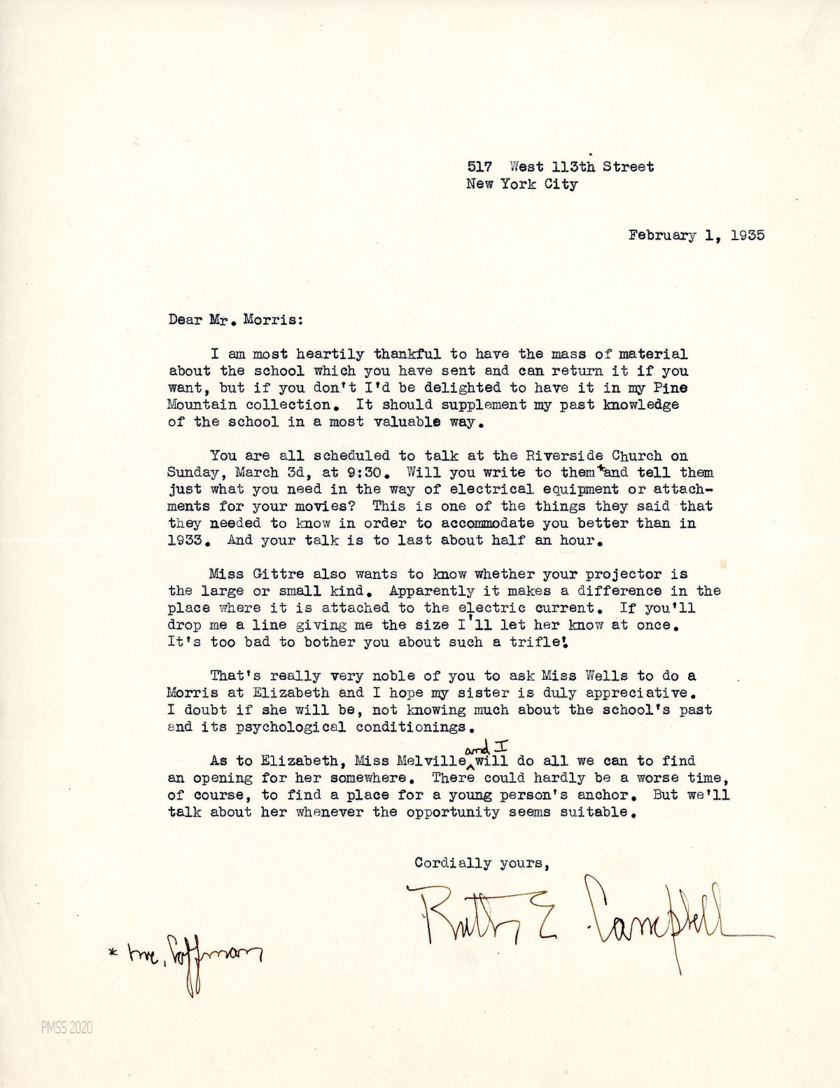 [070] February 1, 1935. To Morris from Campbell, thanking him for all the PMSS information he sent. She will add it to her “Pine Mountain Collection,” if he doesn’t want it returned. She has scheduled him and Wells for the Riverside Church talk for March 3. She and Melville help find an opening for Elizabeth.