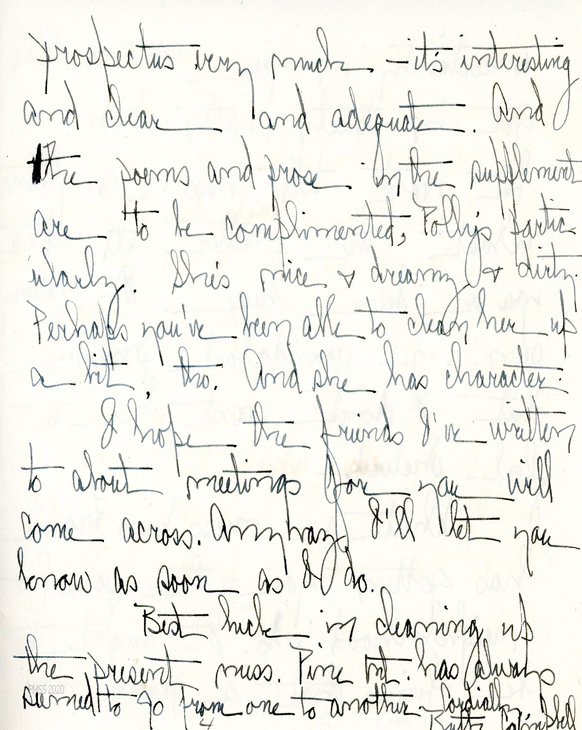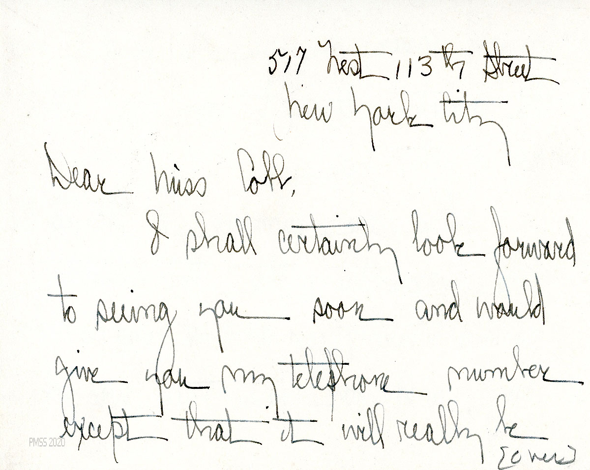 [065] N.D. To Morris from Campbell, who, after talking with Miss [Alice] Cobb “as one secretary to another,” tells Morris (apologetically) of her concerns about the School’s problems: “…I thought you were going to have a tough time steering a course between the presentation of the dances and ballads as an evening of art, and as a plea for interest in the school.” She also worries about confidentiality when using student help in the Office.