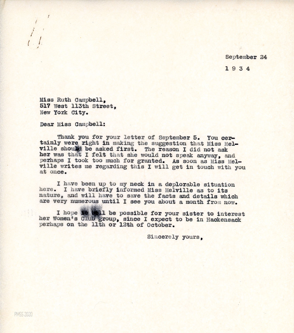 [058] September 24, 1934. To Campbell from [unsigned, apparently Morris], who agrees he should have asked Melville first. He will be in Hackensack in October.
