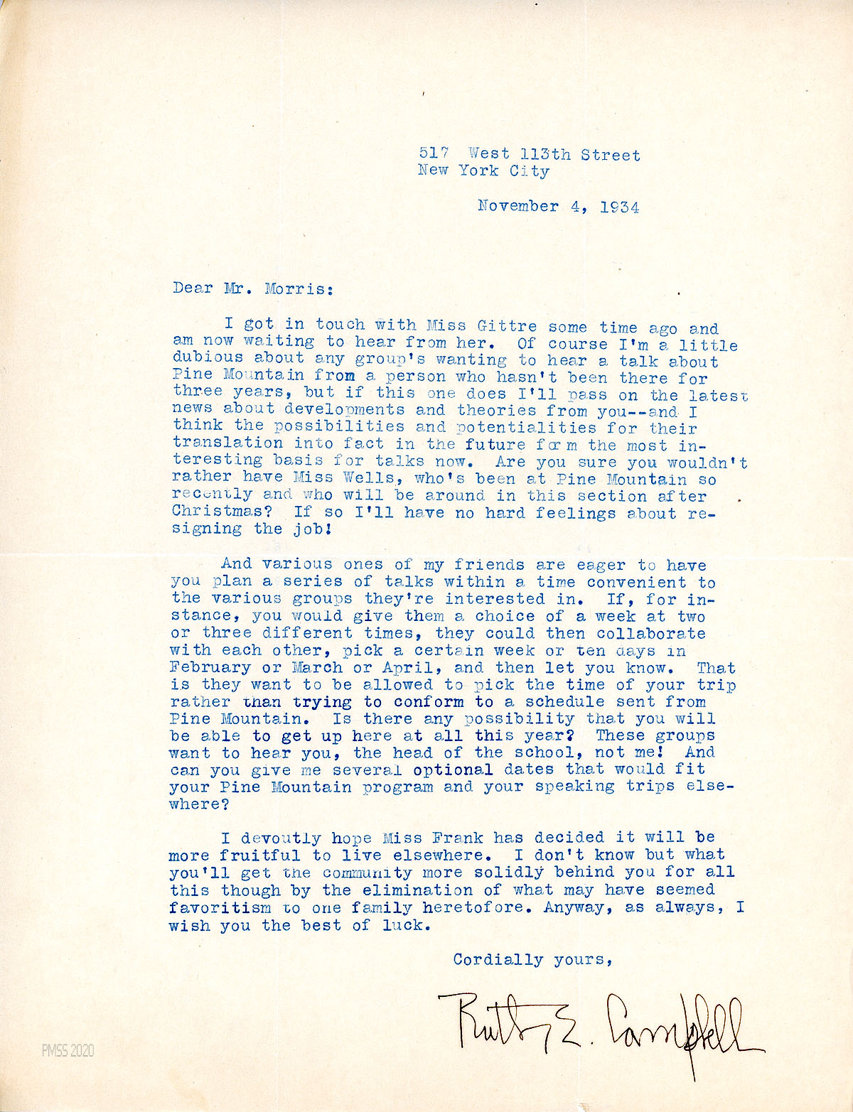 [060] November 4, 1934. To Morris from Campbell, who describes her plans for her talks before groups: “…I’ll pass on the latest news about developments and theories from you — and I think the possibilities and potentialities for their translation into fact in the future form the most interesting basis for talks now.” She asks Morris if he’d rather have Miss Wells, who had visited Pine Mountain recently; suggests arrangements for Morris to talk; mentions Miss Frank.