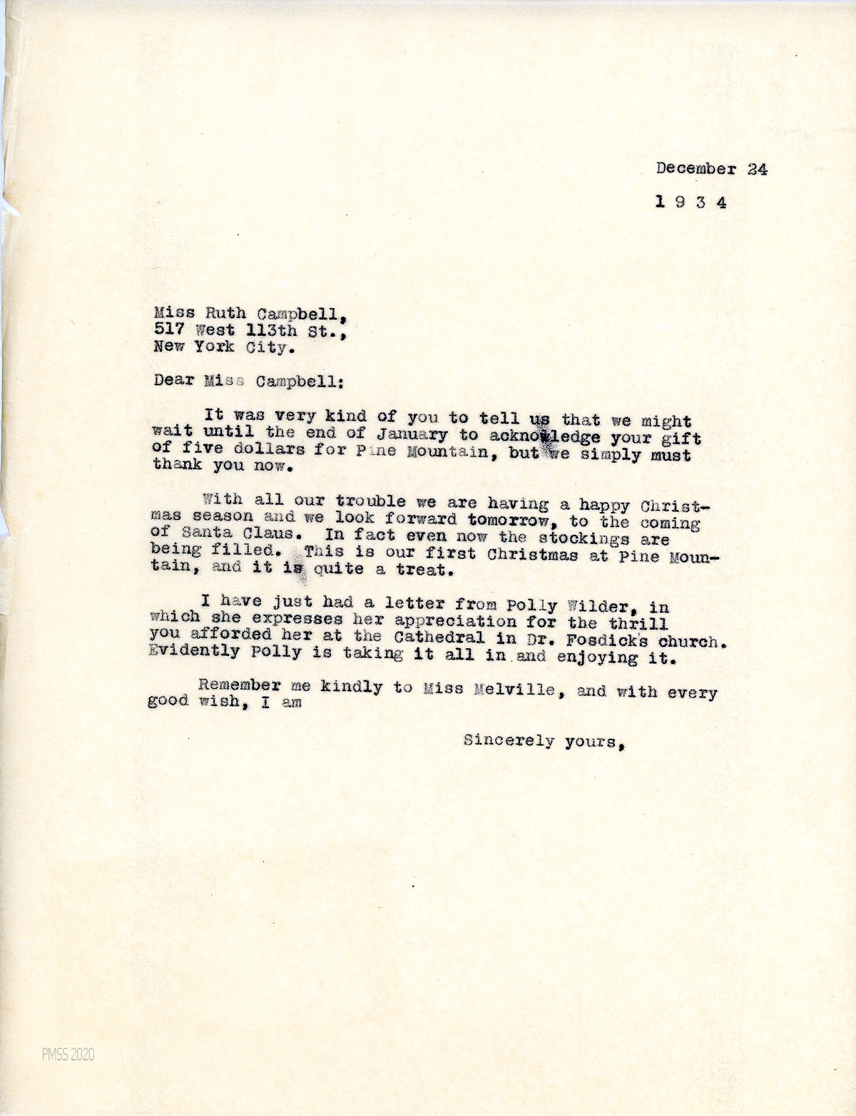[064] December 24, 1934. To Campbell from [unsigned, apparently Morris], thanking her for a $5.00 gift; mentions Christmas celebration at PMSS. He received a letter from Polly Wilder, who enjoyed Campbell at the Cathedral in Dr. Fosdick’s church.