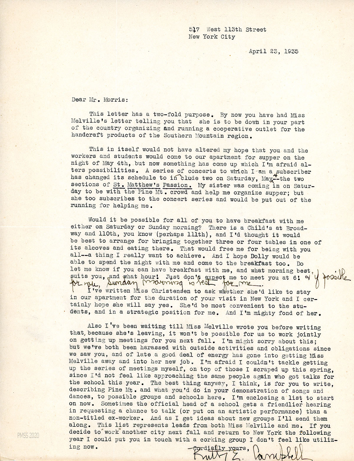 [075] April 23, 1935. To Morris from Campbell. Melville is moving south to organize and run a “cooperative outlet for the handcraft products of the Southern Mountain region.” Asks if she can change the date of her breakfast with Morris and students at Child’s in NYC. Campbell invited Miss Christensen to stay with her during Morris’s visit. With Melville’s departure, “it won’t be possible for us to work jointly on getting up meetings for you next fall.” Instead, Campbell suggests that it would be more productive if Morris arranges with official heads of schools himself; she will send him ideas for new groups.