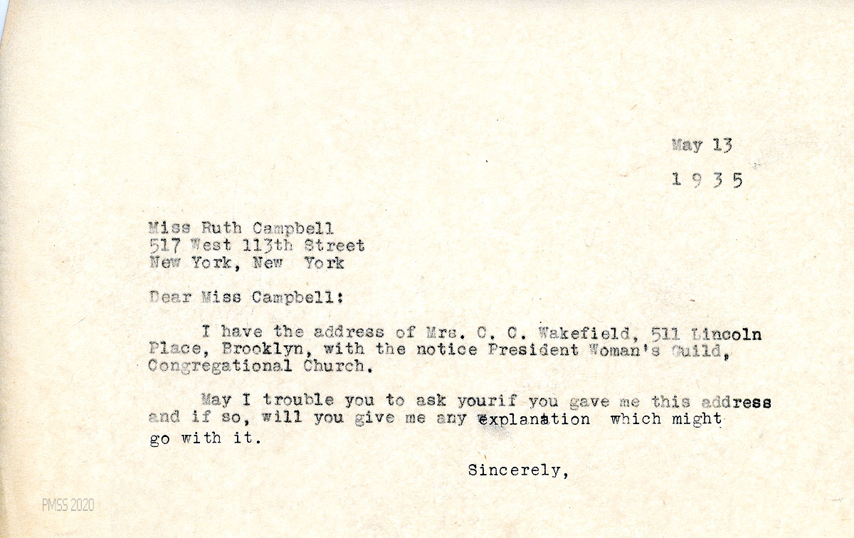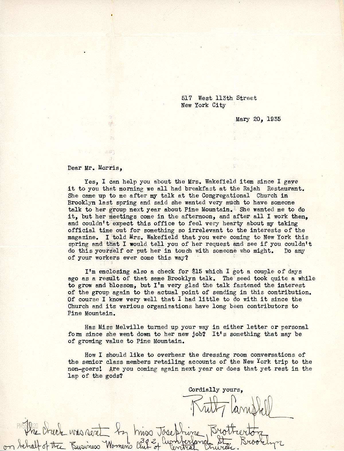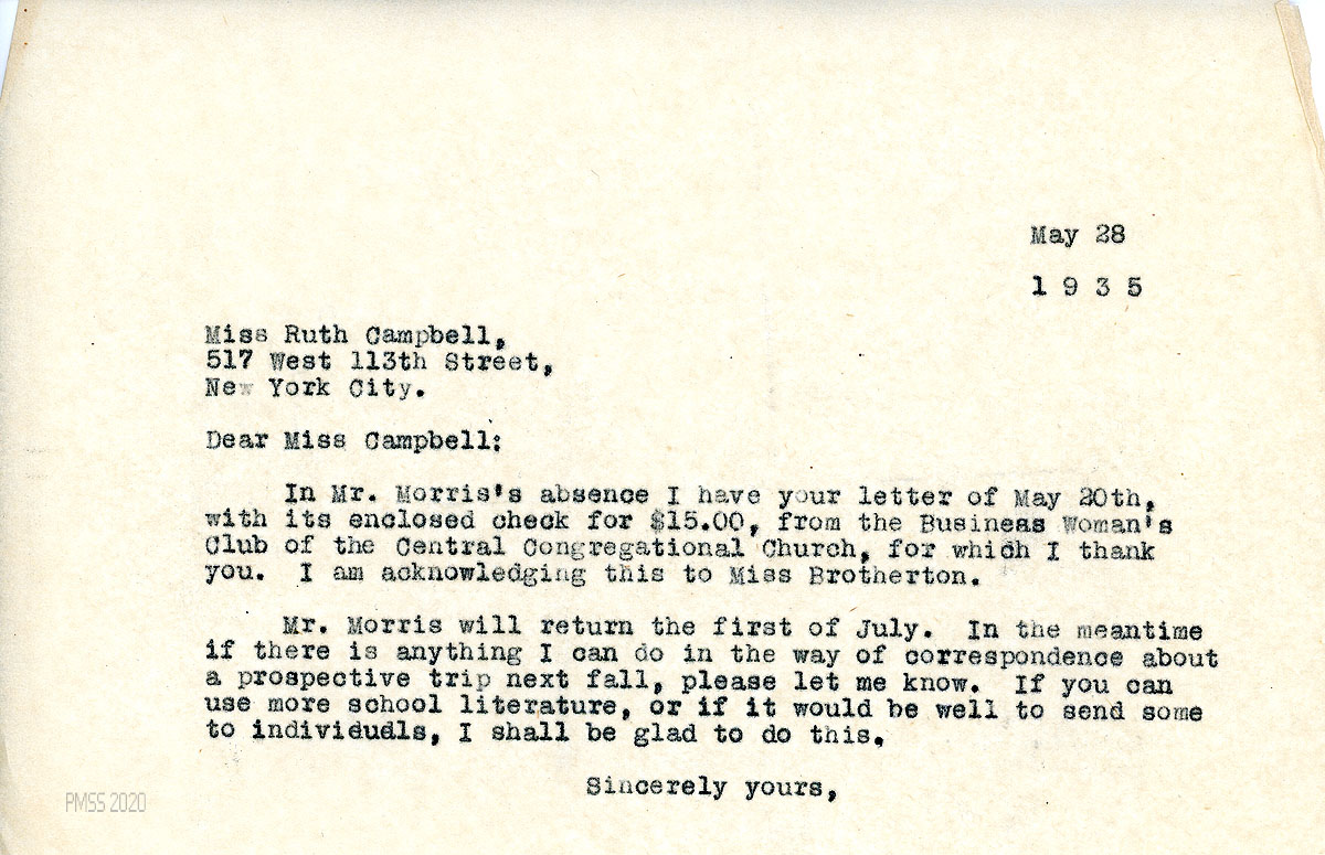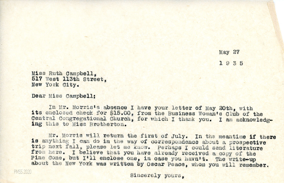 [078] May 20, 1935. To Morris from Campbell. Mentions Mrs. Wakefield’s request for a speaker about PMSS; encloses a $15 check received as a result of her Brooklyn talk. The Central Congregational Church “and its various organizations have long been contributors to Pine Mountain.” Asks if he has seen Miss Melville since she began her new job.