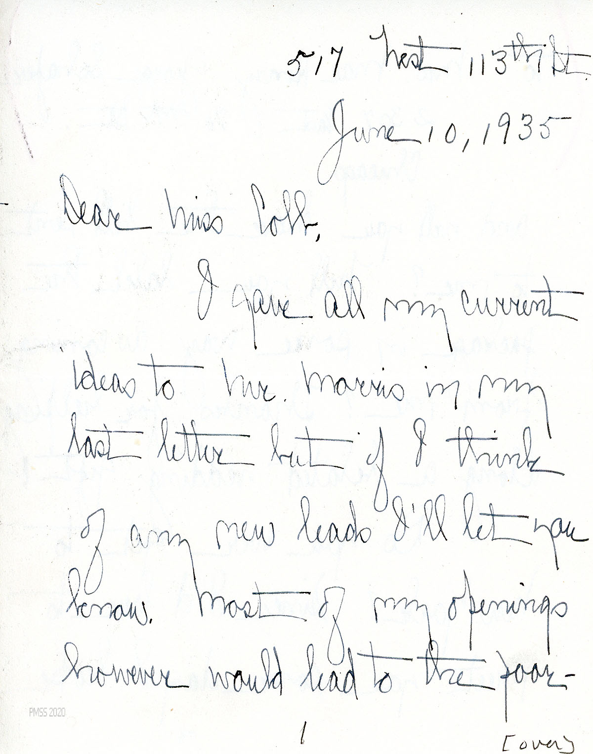 [081] through [081c] June 10, 1935. Handwritten four-page letter to Miss Cobb from Campbell, who will let Cobb know of any new leads. “…[M]ost of the people & organizations I know are poverty-stricken, leading me to the belief that almost everything really interesting and worth engaging in struggles for existence. Orders a stool from the fireside department. Hopes to meet Cobb someday.