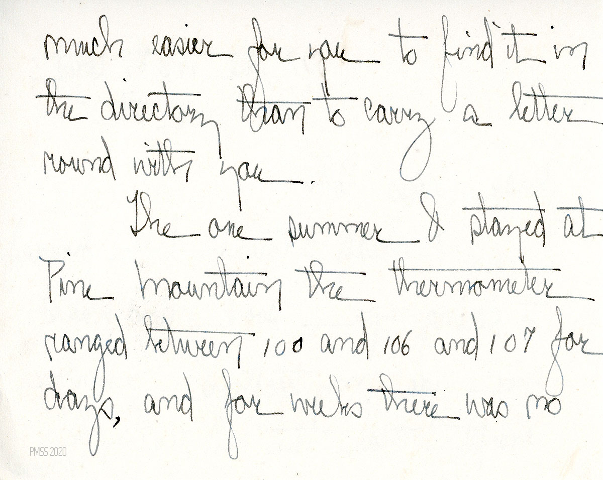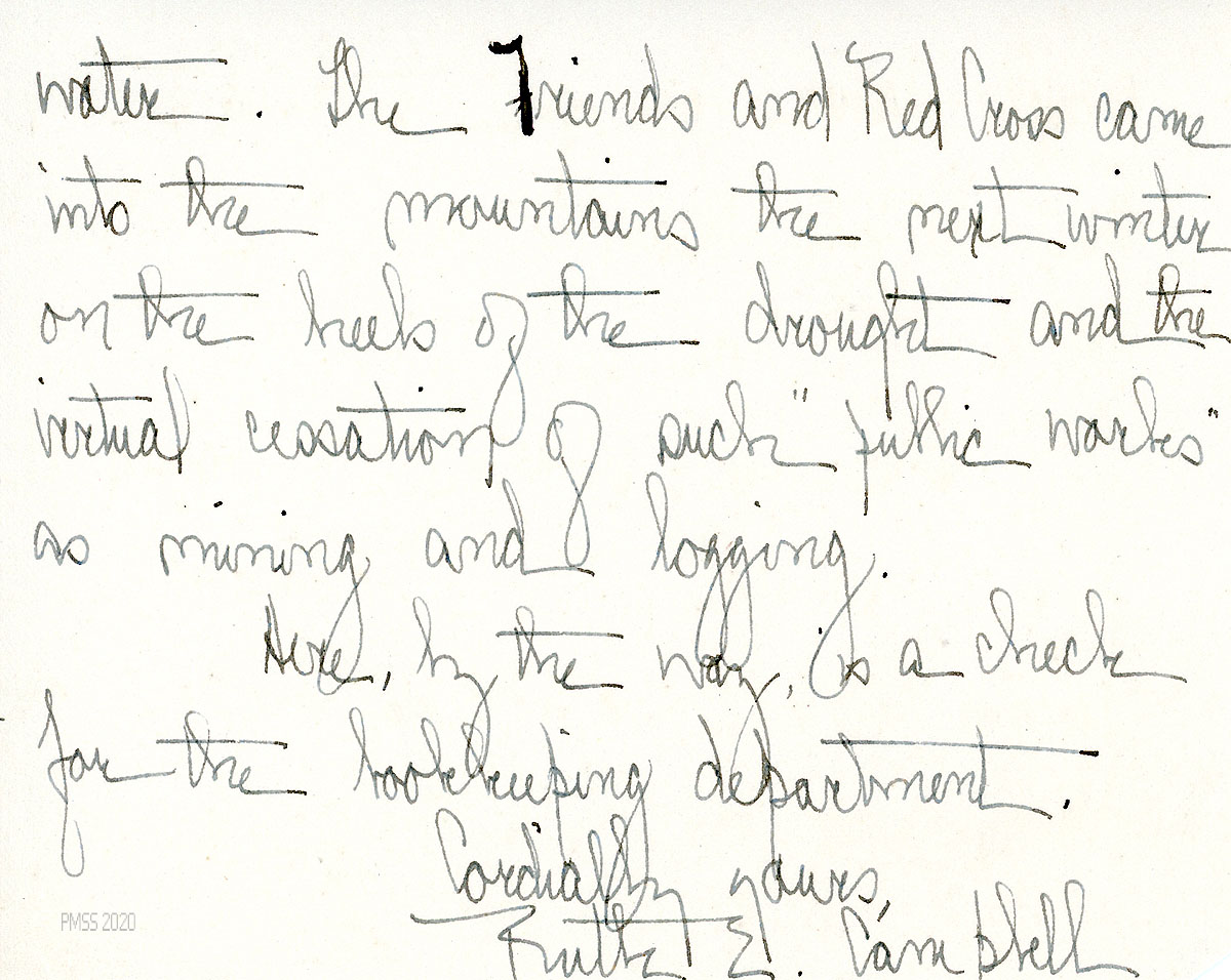 [083] through [083b] N.D. Handwritten three-page letter to Miss Cobb from Campbell, who looks forward to seeing Cobb; encloses a check. “The one summer I stayed at Pine Mountain the thermometer ranged between 100 and 106 and 107 for days, and for weeks there was no water. The Friends and Red Cross came into the mountains the next winter on the heels of the drought and the virtual cessation of such ‘public works’ as mining and logging.”