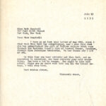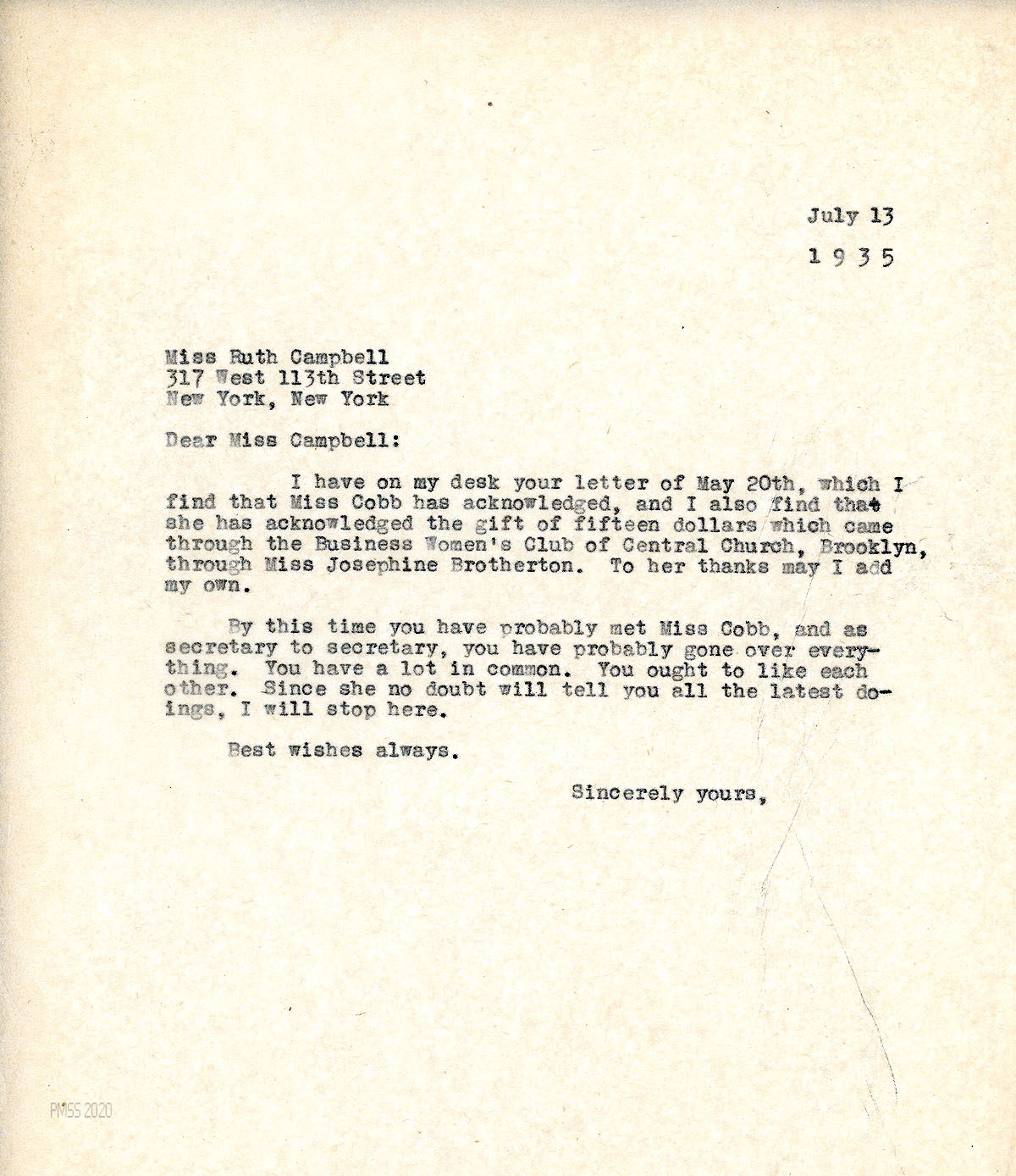 [084] July 13, 1935. To Campbell from [unsigned, likely Morris], who refers her from her May 20th letter. “By this time you have probably met Miss Cobb, and as secretary to secretary, you have probably gone over everything. You have a lot in common. You ought to like each other…. “