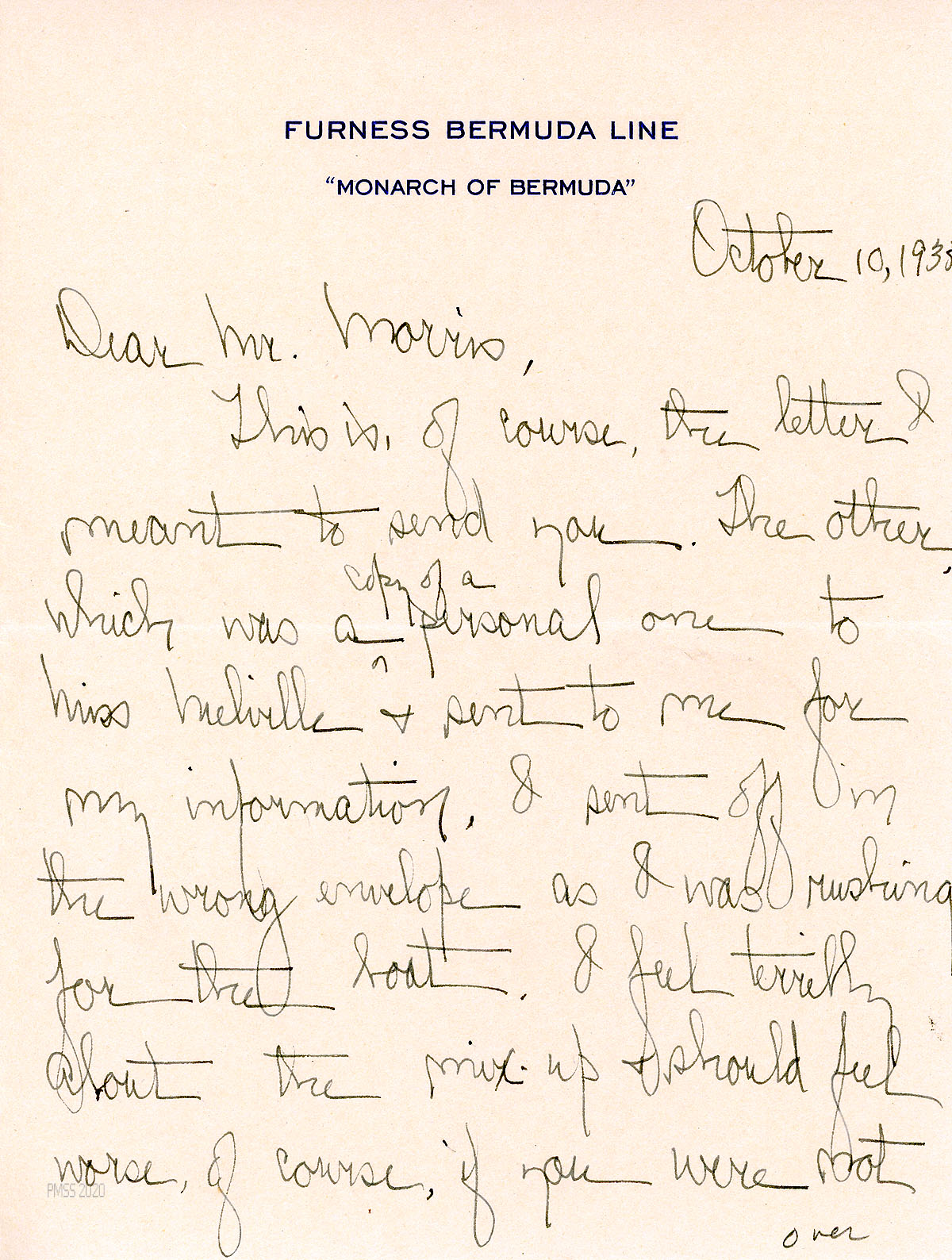 [086], [086a] October 10, 1935. Handwritten two-page letter to Morris from Campbell on letterhead for “Furness Bermuda Line, ‘Monarch of Bermuda.’” Apologizes for sending the wrong letter (a copy of her letter to Melville).