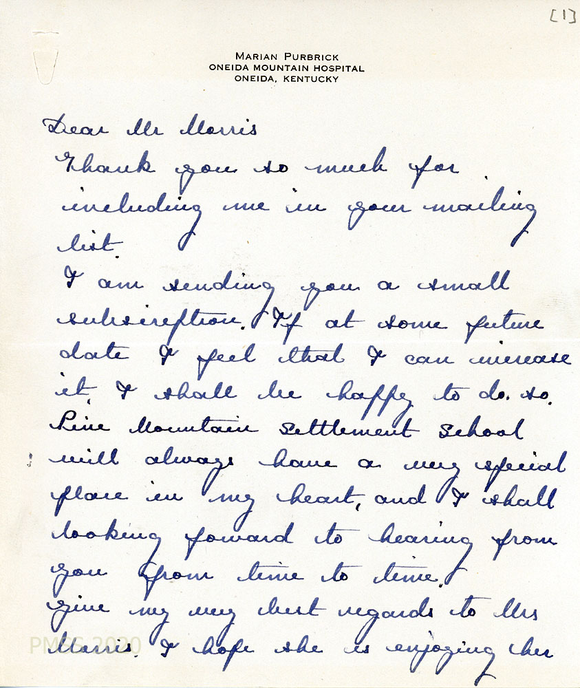 [1932_040], [040a] April 11, 1932. Two-page letter to Morris from Purbrick, thanking him for including her on the PMSS mailing list; enclosing “a small subscription…”Pine Mountain Settlement School will always have a very special place in my heart…”