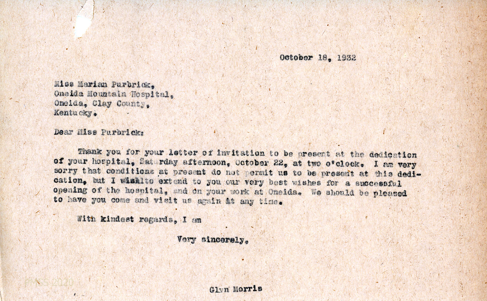 [1932_043] N.D., apparently October 1932. To Morris from Purbrick, who invites Morris and Dr. [Kenneth] Gould to the dedication of the Oneida Mountain Hospital.