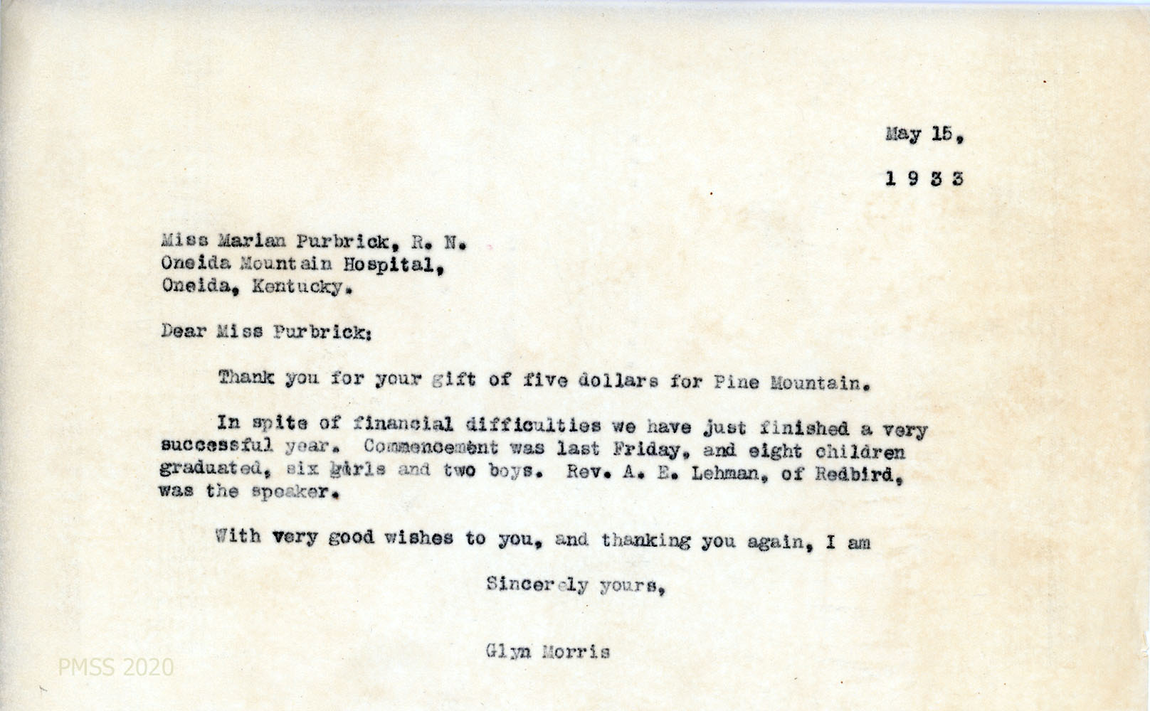 [1932_045] May 15, 1933. To Purbrick from Morris, thanking her for her $5 donation; describes the School’s commencement.