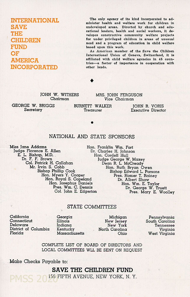 [1934_002] through [002b] Cover for “Save the Children.” Notation in Pettit’s handwriting: “Mrs. W.C. Clemmons [illegible].” [002a] “20000 Children Helped Last Year: Typical Achievements of 1934” with map. [002b] “International Save the Children Fund of America Incorporated” with a paragraph describing the organization and names of the executive staff, national and state sponsors, and state committees.