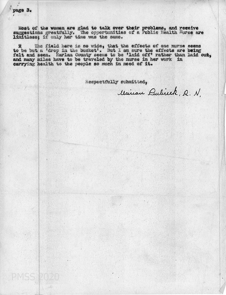 [1934_006] through [006b] Carbon copy of a typewritten three-page “Report of the Public Health Nurse, Harlan County Save the Children Fund of America, January 15th – March 1st.” written by Marian Purbrick, R.N.